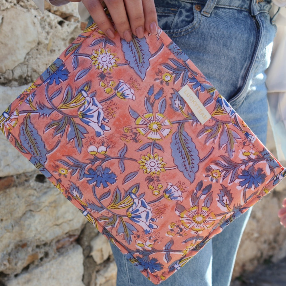 Grande pochette de voyage orange & fleurs bleues