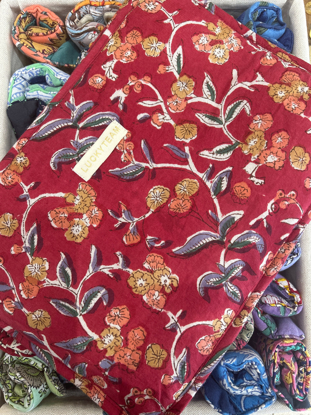 Grande pochette de voyage rouge & fleurs jaunes et oranges