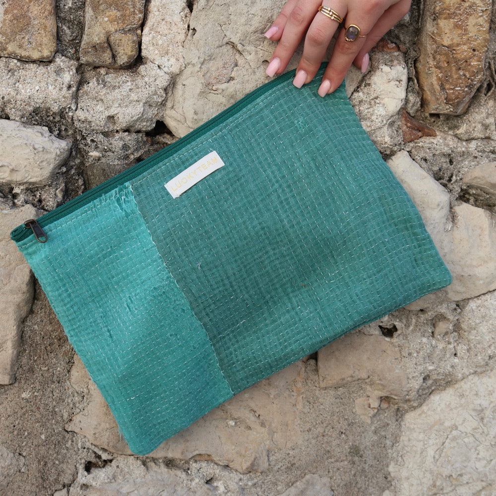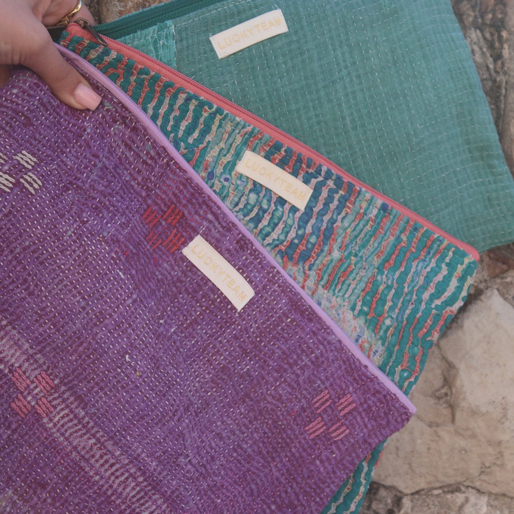 Nos pochettes en Kantha sont entièrement réalisées à la main à partir d'anciens saris traditionnels. Ils sont ré-assemblés tel un patchwork grâce à à la méthode du Kantha qui est un point de couture spécifique.
