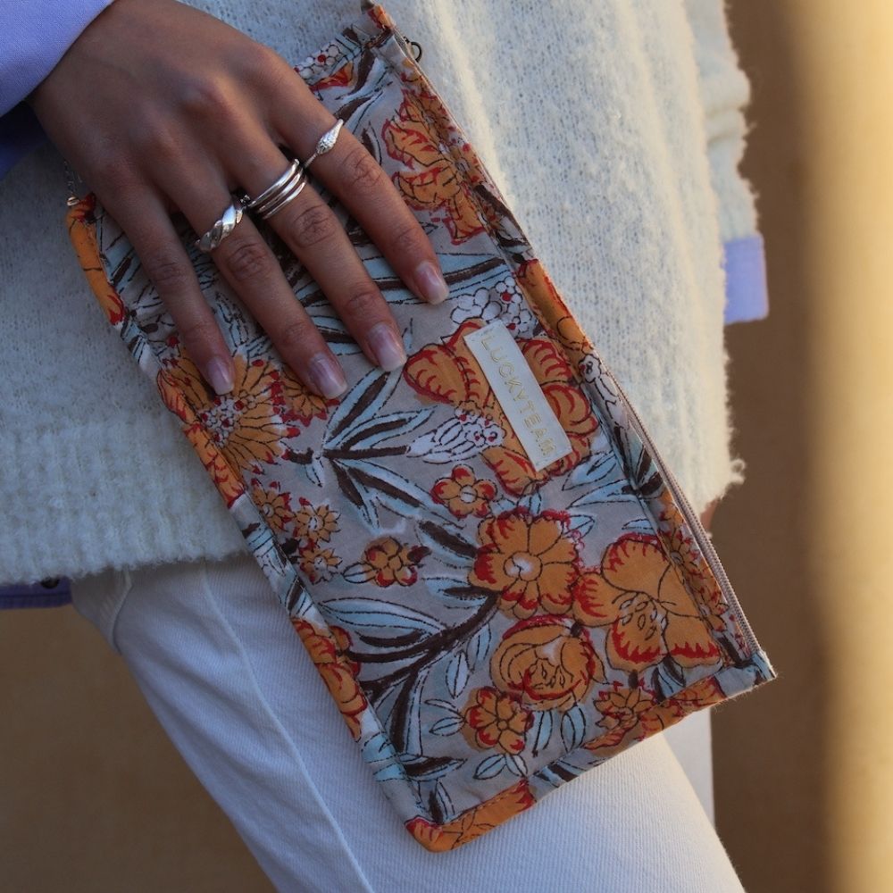 Il est temps de voyager léger et rapide avec notre nouvelle pochette de voyage. Nous avons la pochette parfaite ! Réalisée à partir de tissu imprimé en Inde en utilisant la méthode du block print. Elle est de taille compacte et pratique, épaisse et molletonnée, dotée d'une fermeture éclaire, qui vous accompagnera partout. Nous savons que c'est votre nouveau compagnon de voyage !