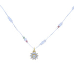 Collier doré fil blanc pierre de lune facettées et pendentif soleil en zircons 38cm
