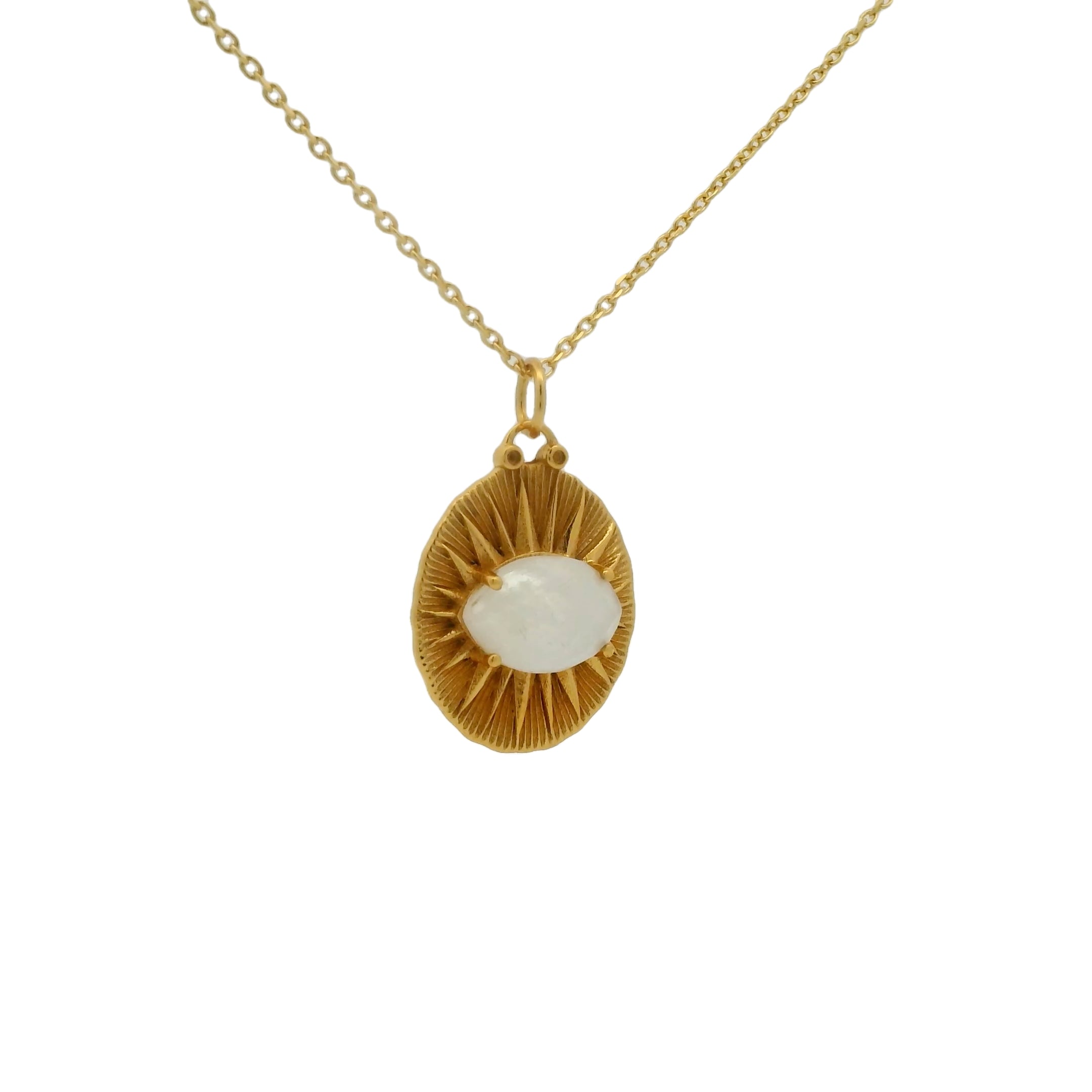 Collier doré médaille rayons de soleil et pierre de lune facettée 42 cm