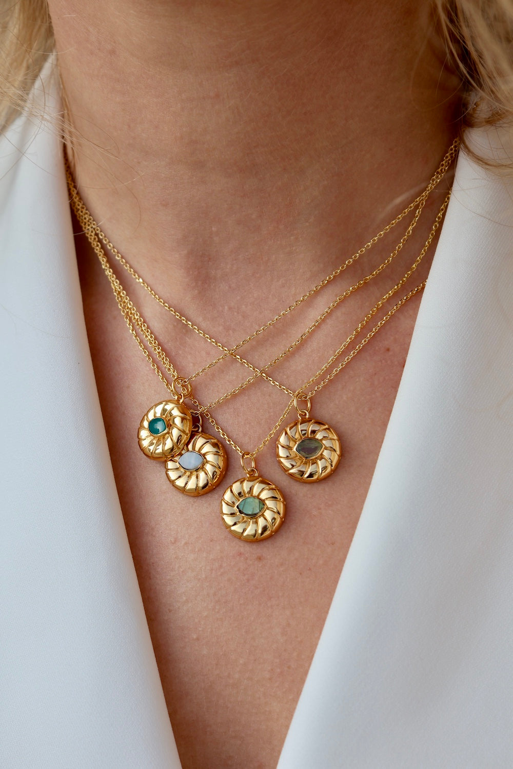 Collier en laiton doré à l'or fin 18k et pendentif médaille texturez en soleil et incrusté d'une pierre naturelle.