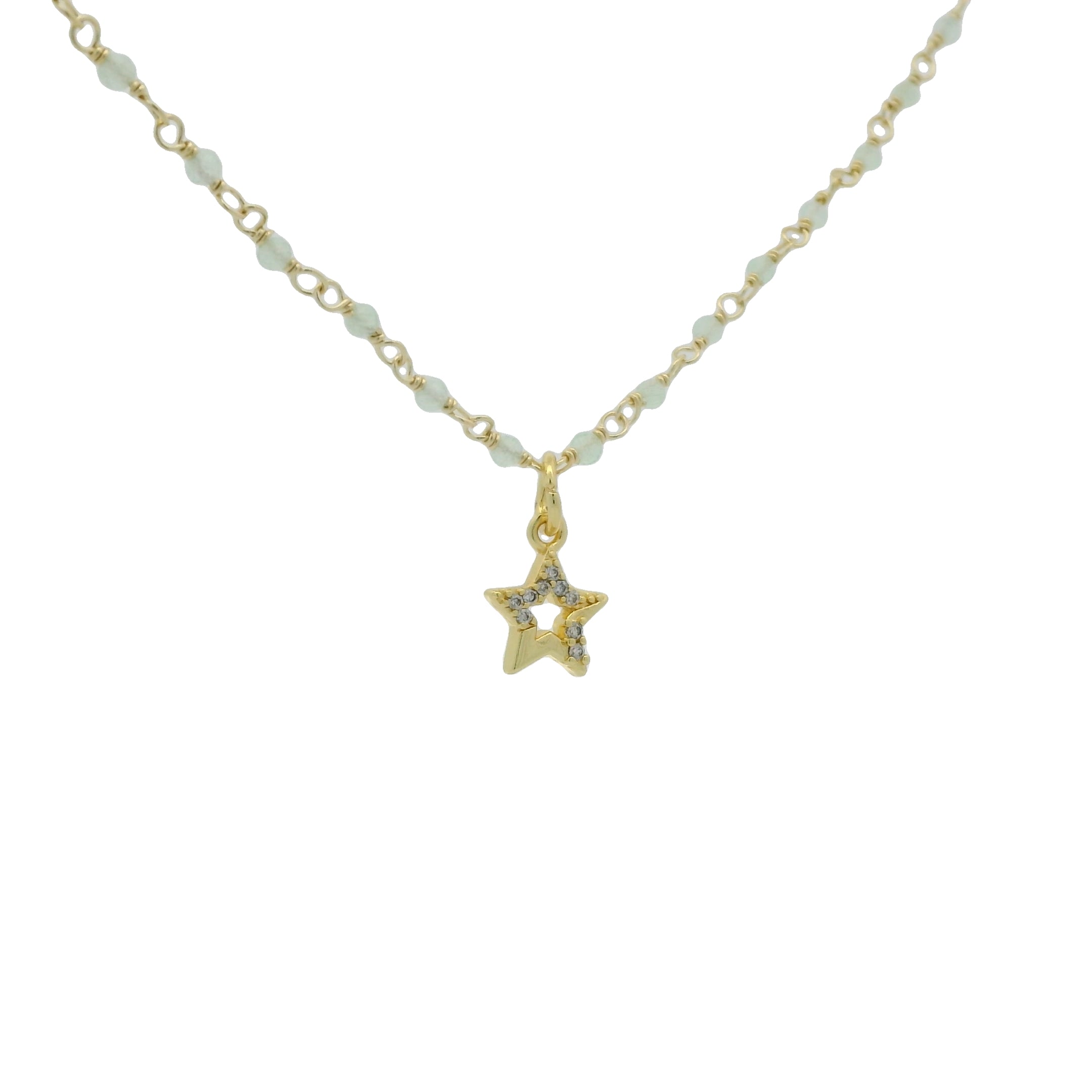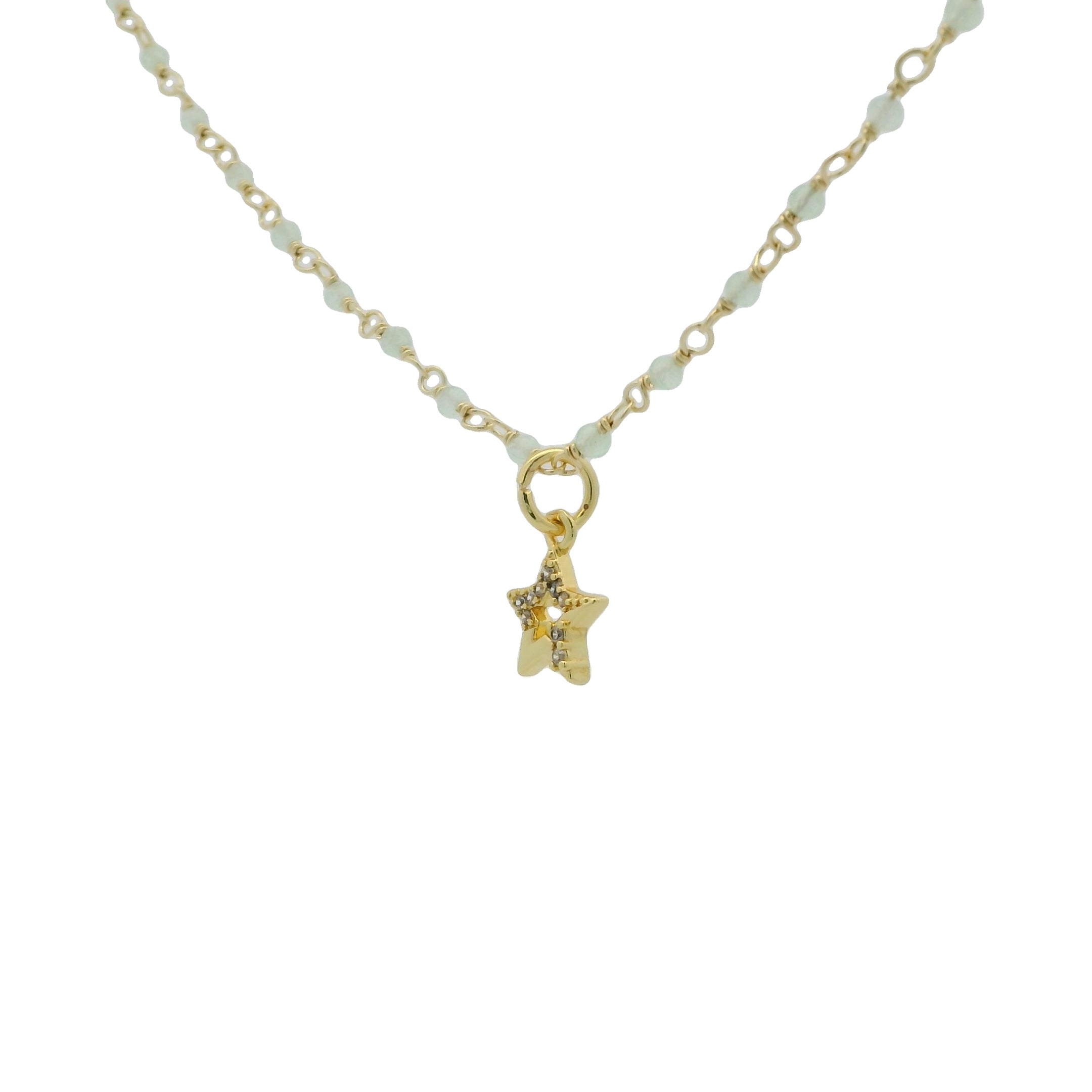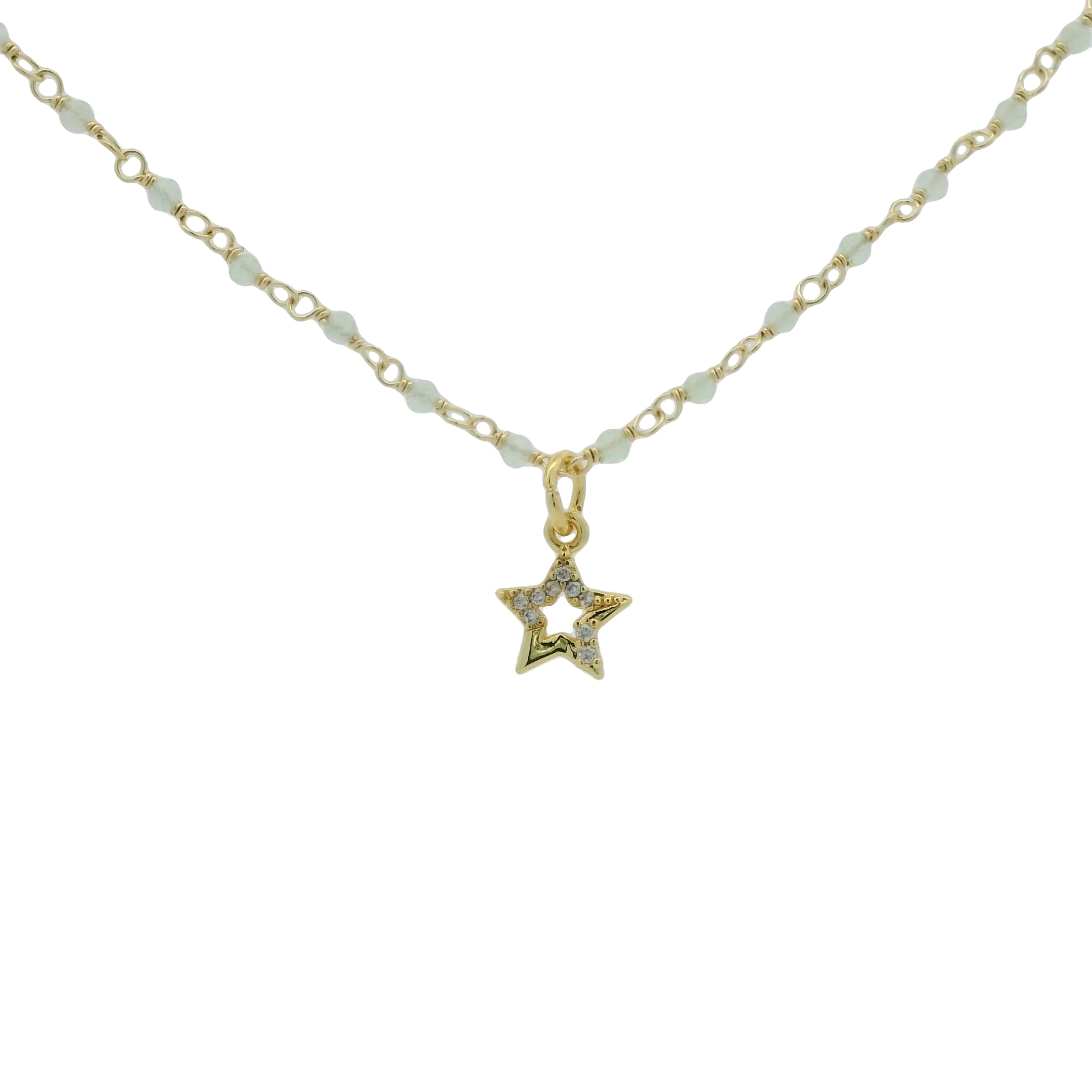 Collier doré rosary préhnite et étoile zircons blancs 38 cm