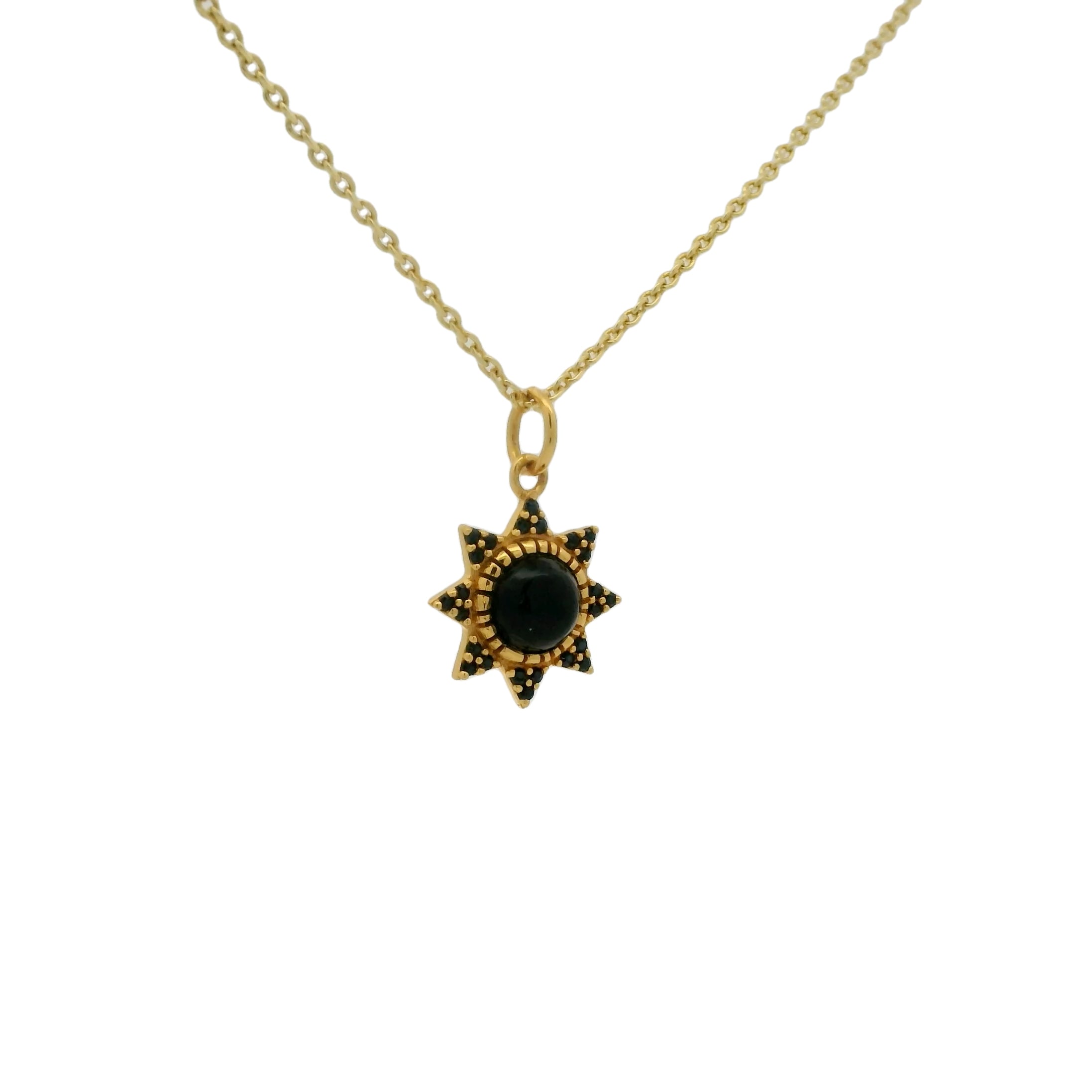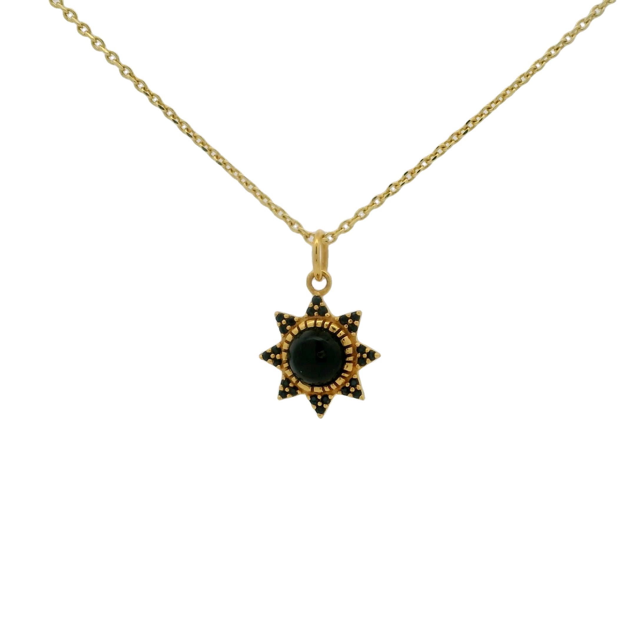 Collier doré soleil onyx noire cabochon zircons noirs 42 cm