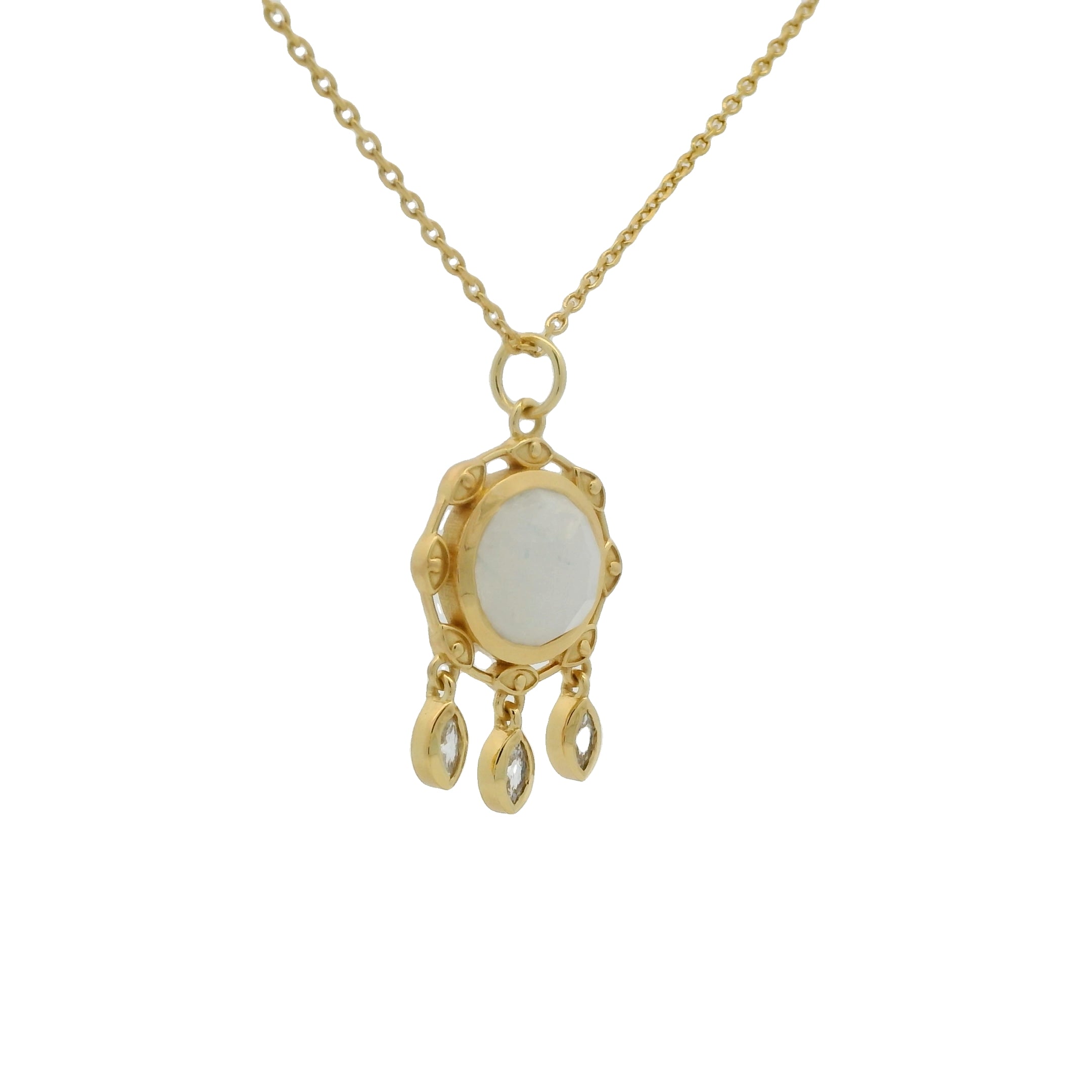 Collier doré pendentif pierre de lune ronde et pampilles zircons blancs 42 cm