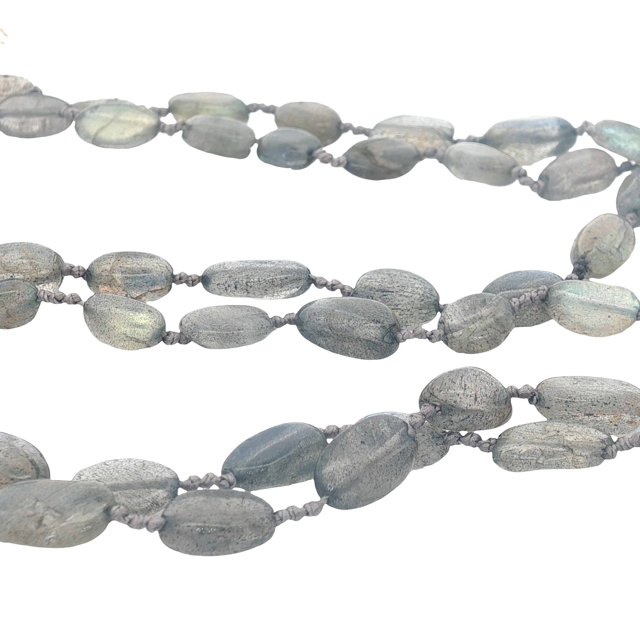 Collier avec perles irrégulières en labradorite espacées par des noeuds gris