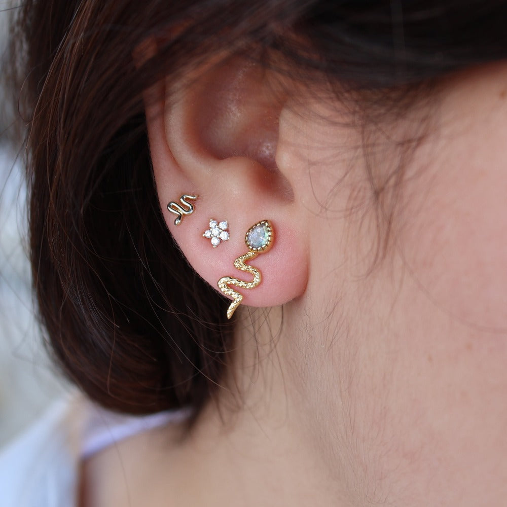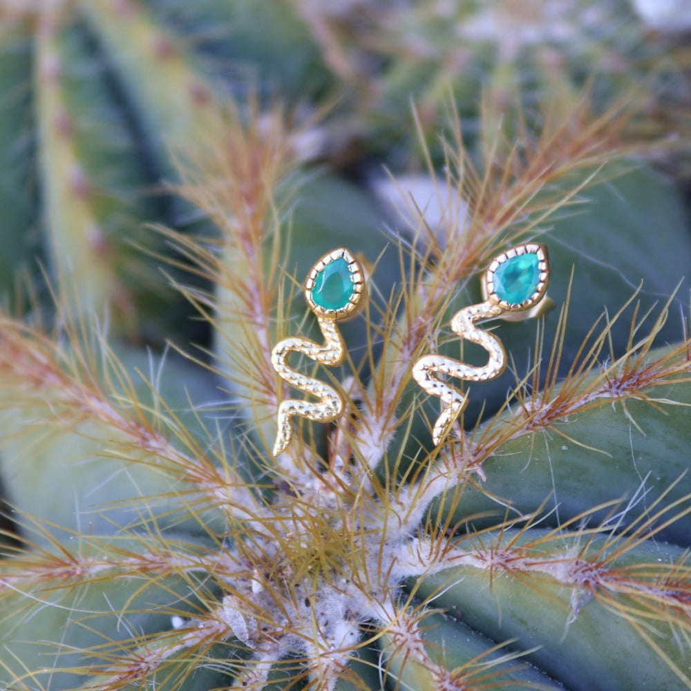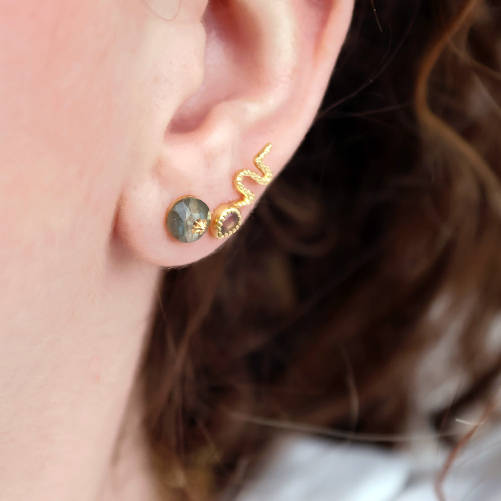 Boucles d'oreilles puces en laiton doré à l'or fin 18k et serpent texturé. Le serpent est orné d'une pierre naturelle en guise de tête.