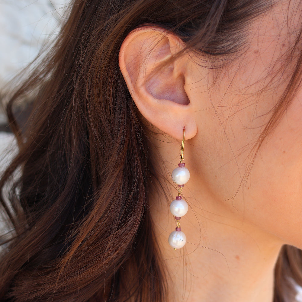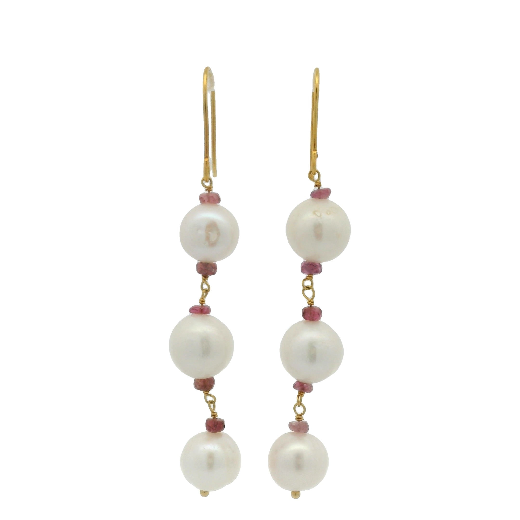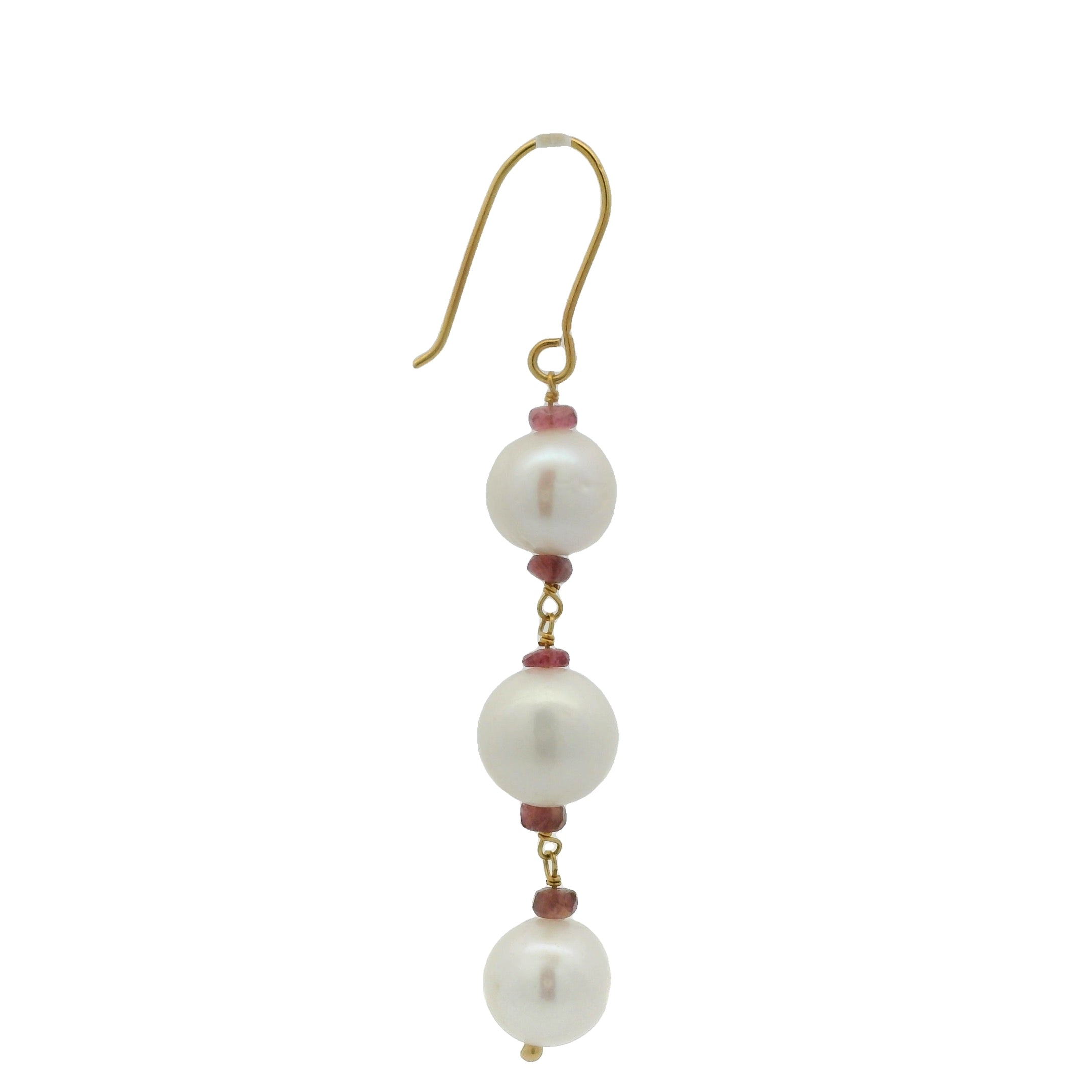 Boucles d'oreilles dorées trio de perles de culture et Tourmaline rose