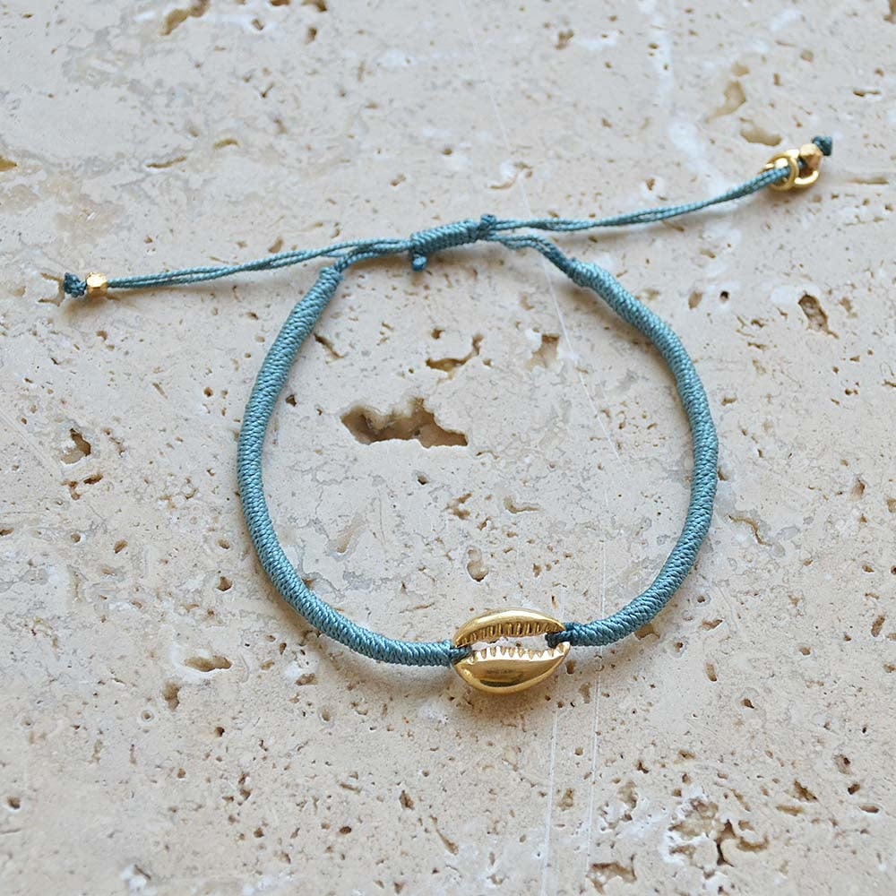 Bracelet cordon gris bleu et cauri doré