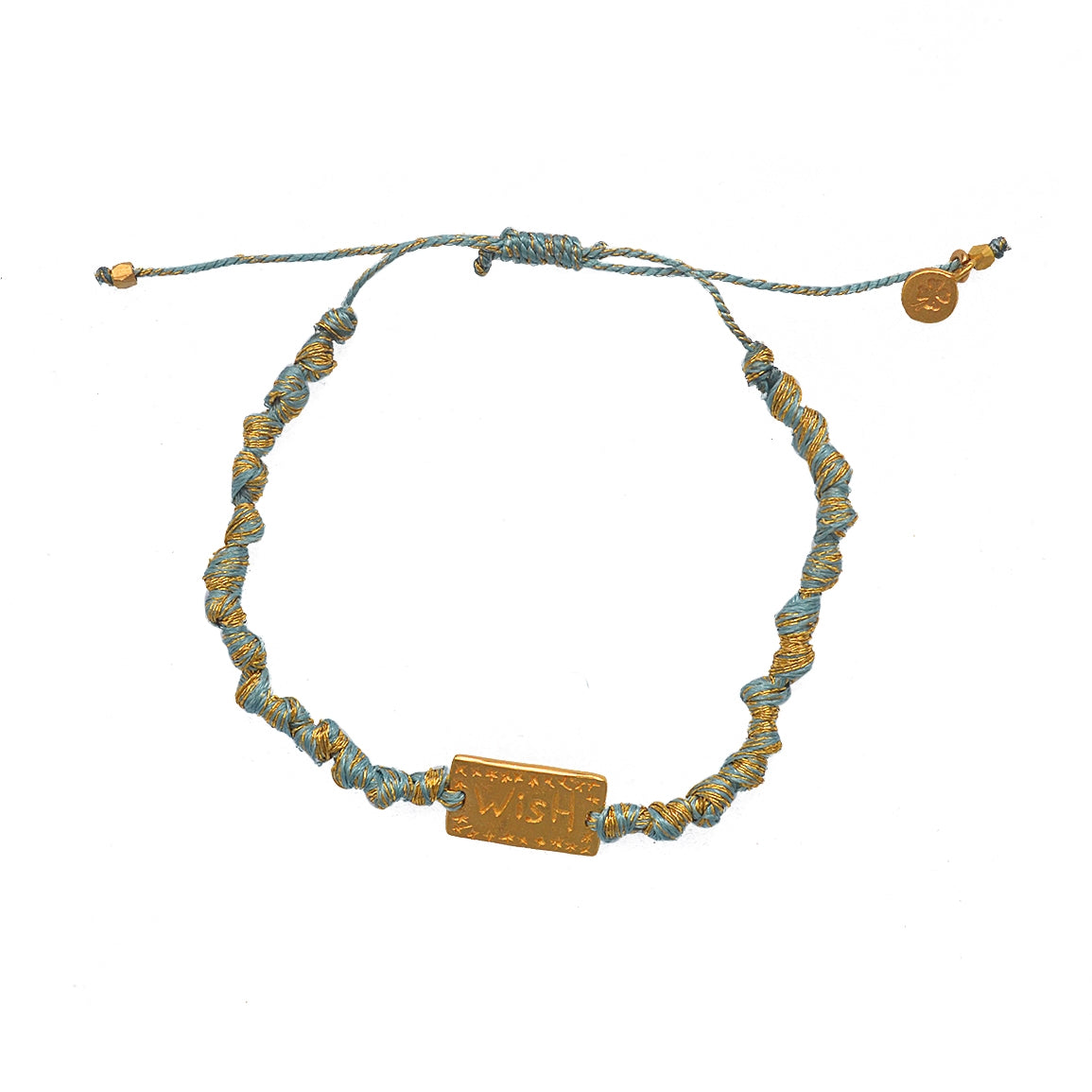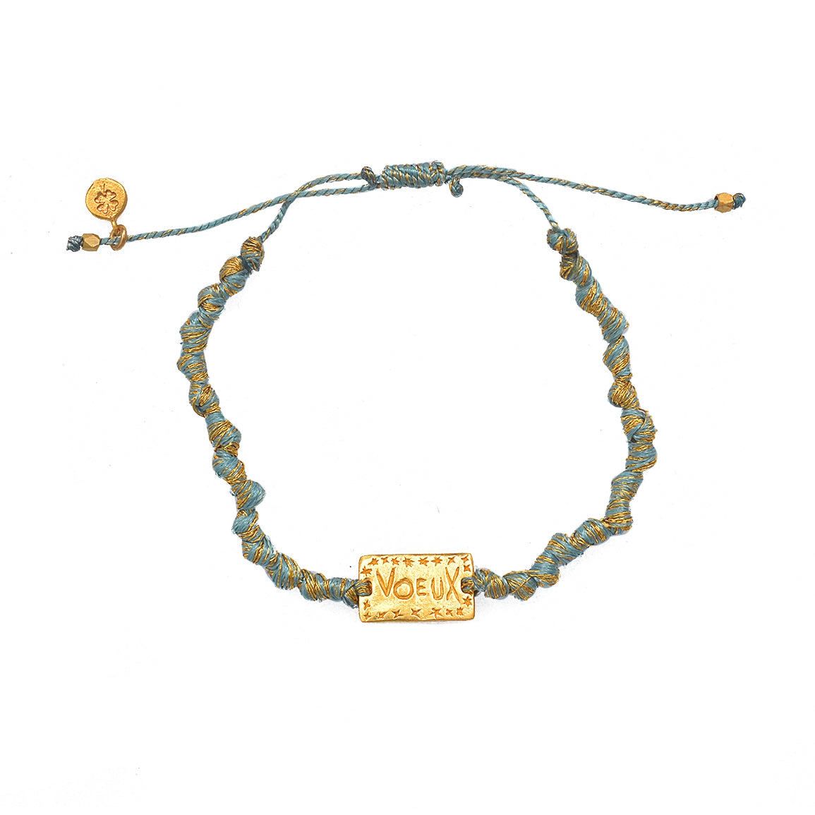 Bracelet cordon bleu doré et plaque Wish / Voeux