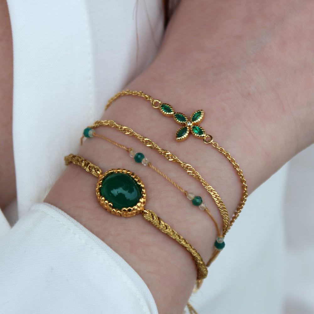 Bracelet cordon tressé doré et pierre cabochon - ONYX VERTE