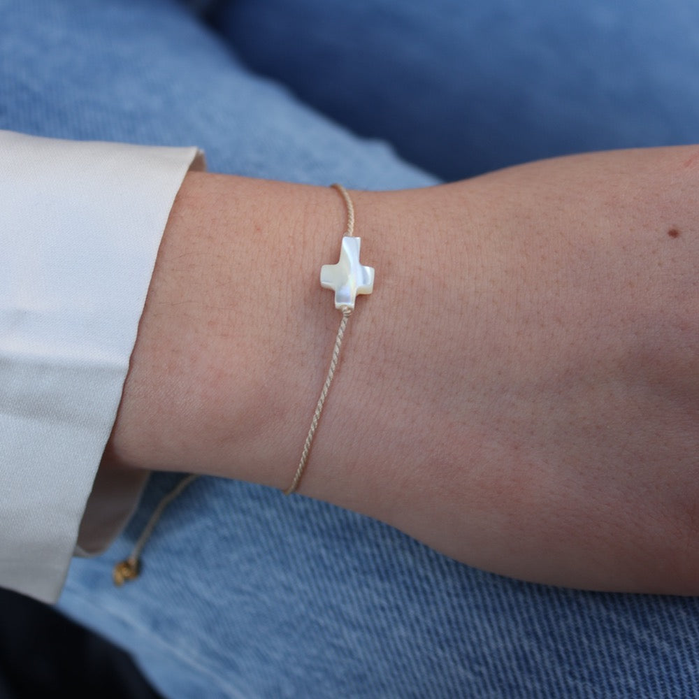 Bracelet sur fil beige avec finitions en laiton doré à l'or fin 18k