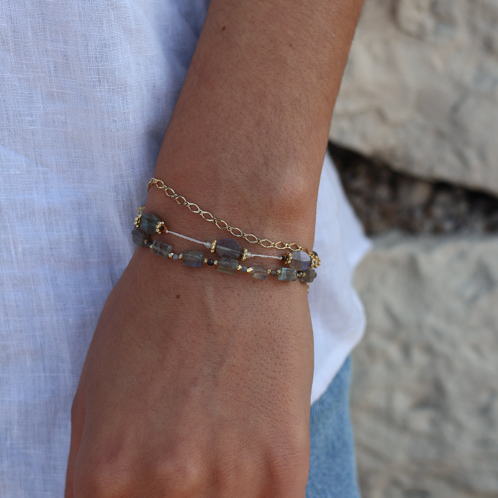 Bracelet duo de pierres en labradorite ornées de petites perles dorées