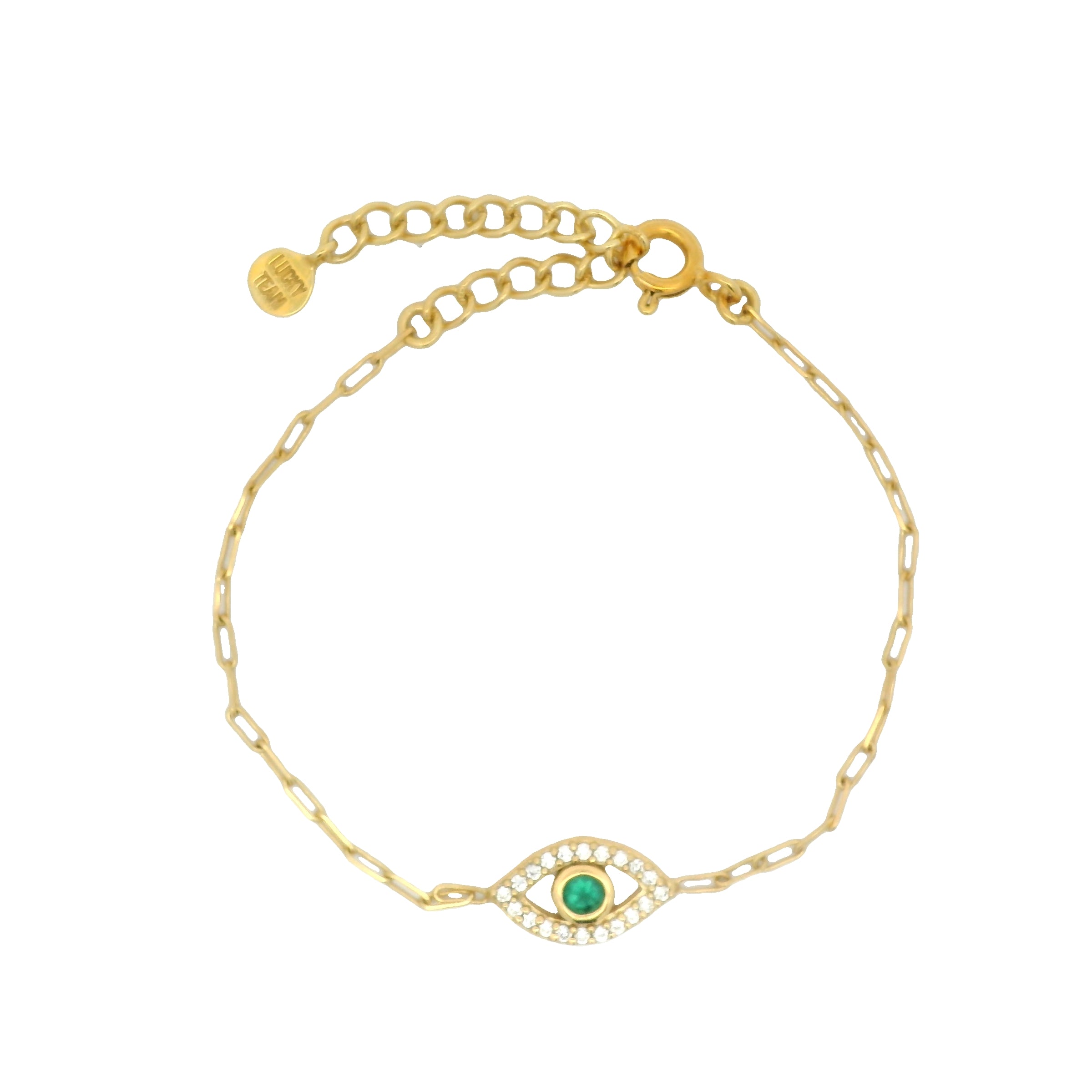 Bracelet doré maille rectangle avec oeil en onyx verte et zircons blancs