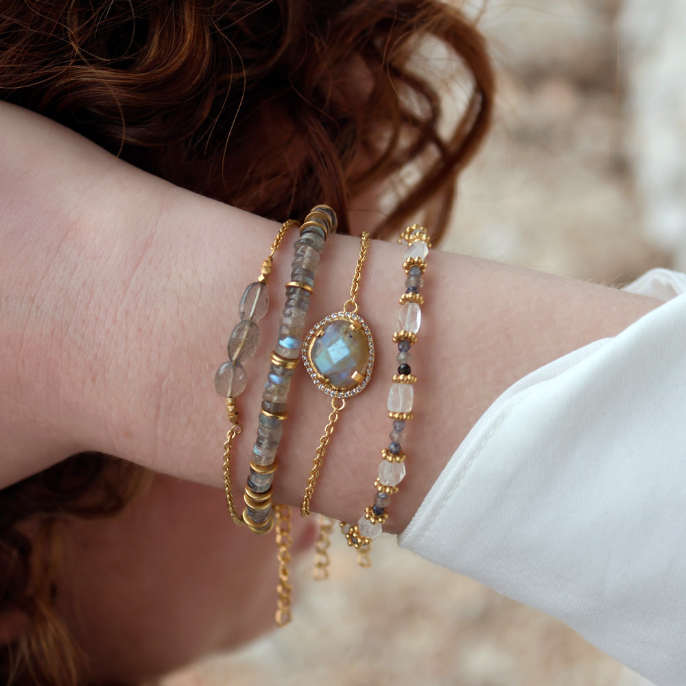 Bracelet en laiton doré à l'or fin 18k et pierre naturelle semi précieuse. La pierre est sertie de 4 griffes et ornées de zircons tout autour.