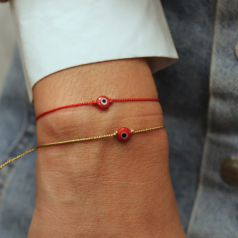 Bracelet fil fin doré ou rouge et oeil porte bonheur rond plat.