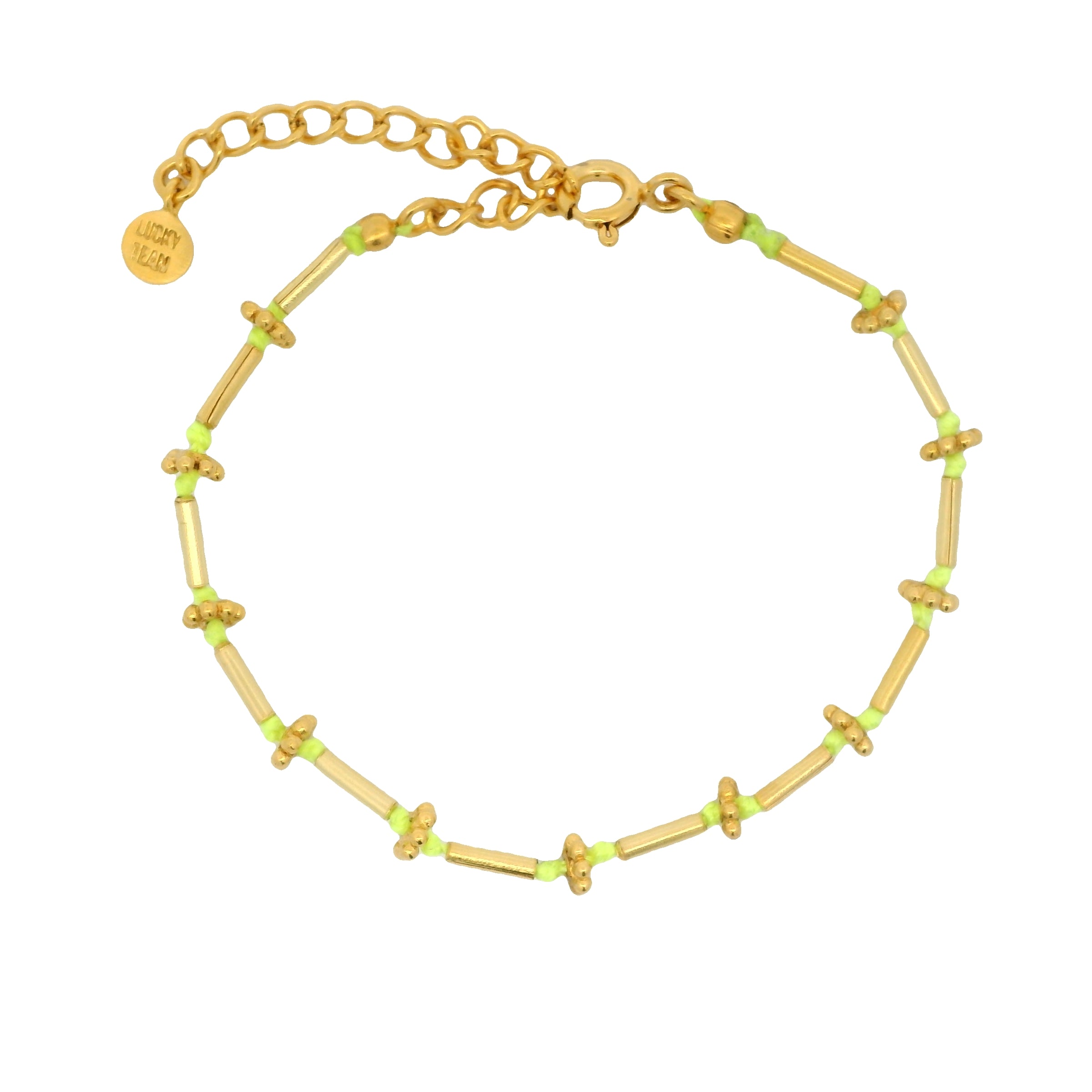 Bracelet tubes avec perles jaune fluo entourées de couronnes dorées