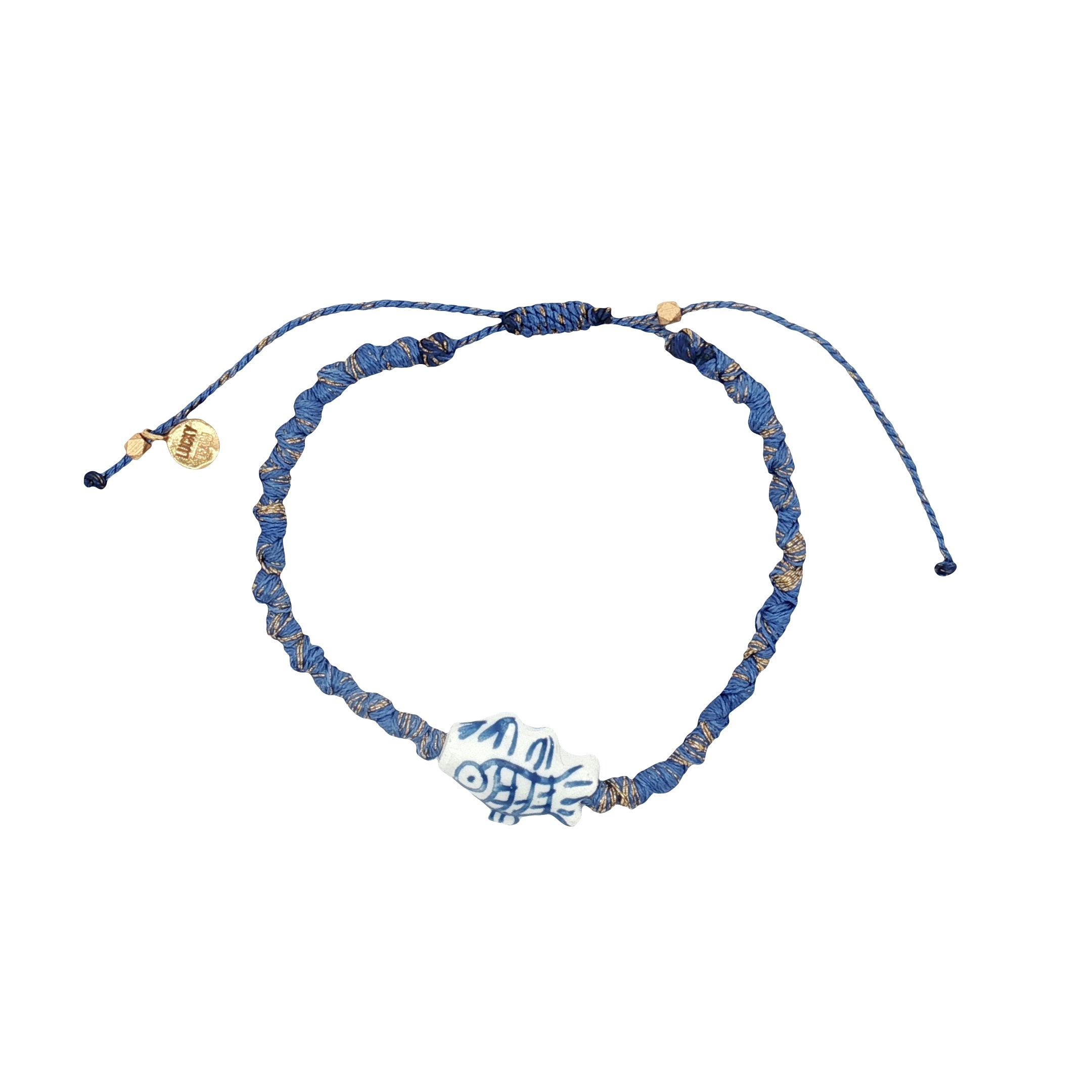 Bracelet cordon bleu et doré poisson blanc et bleu