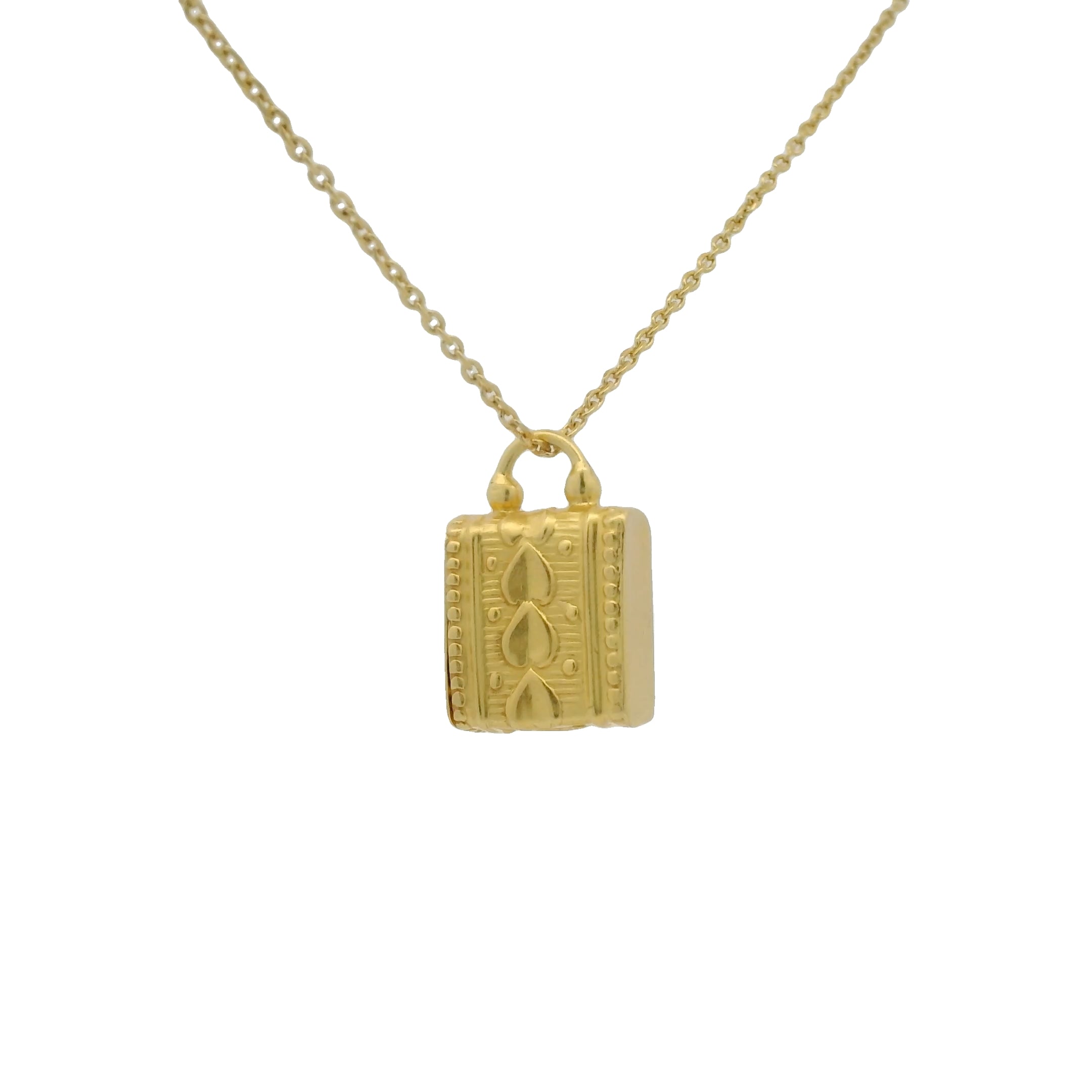 Pendentif mate estampillé à la main. Des motifs tels des coeurs habillent la boîte des deux côtés.