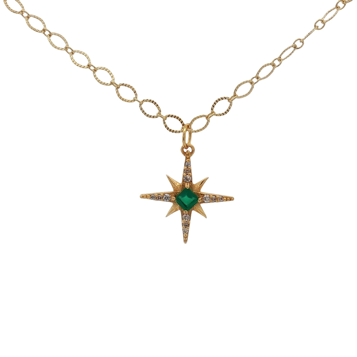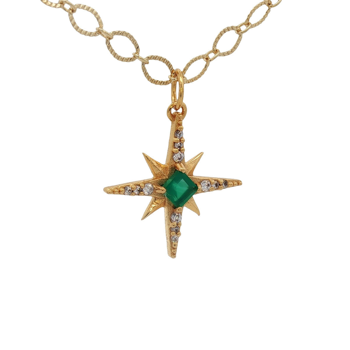 Collier doré étoile des vents onyx verte et zircons 42 cm