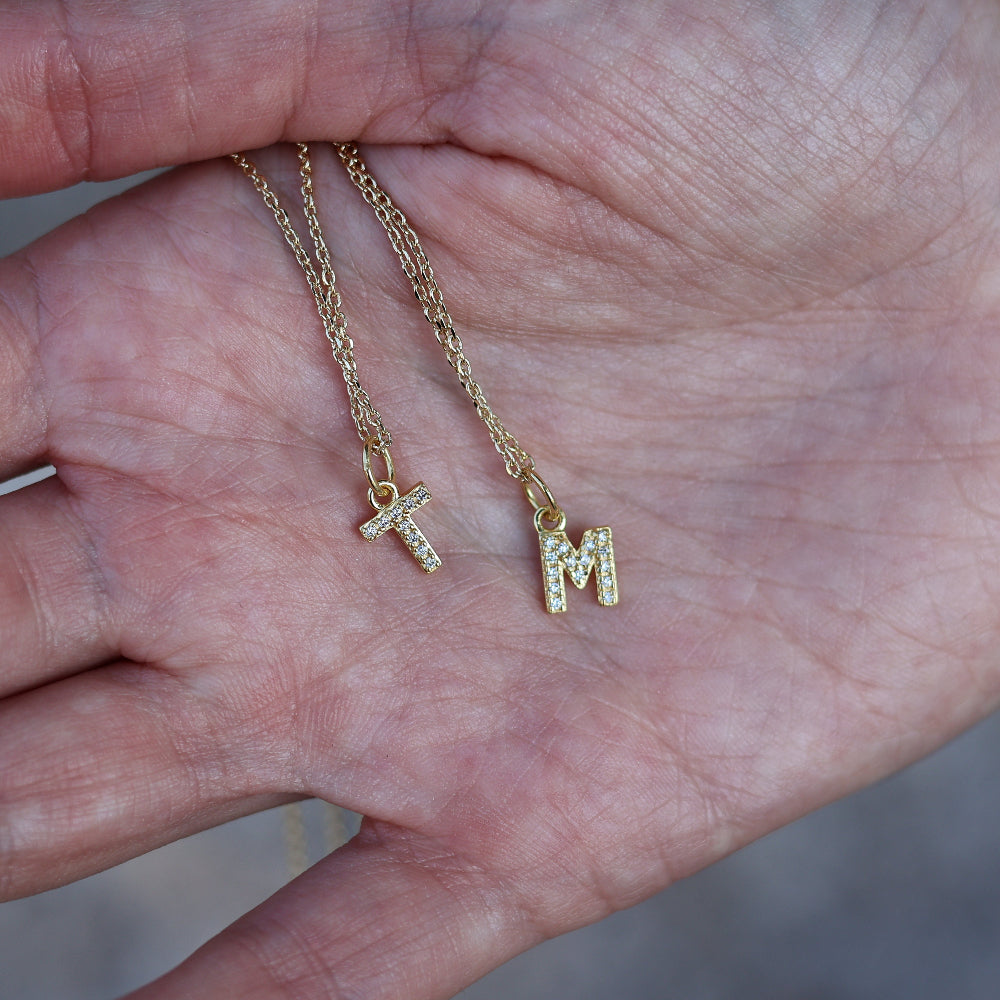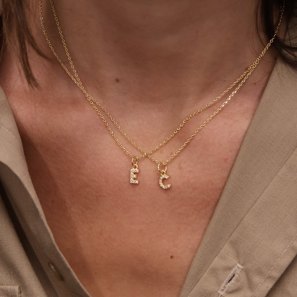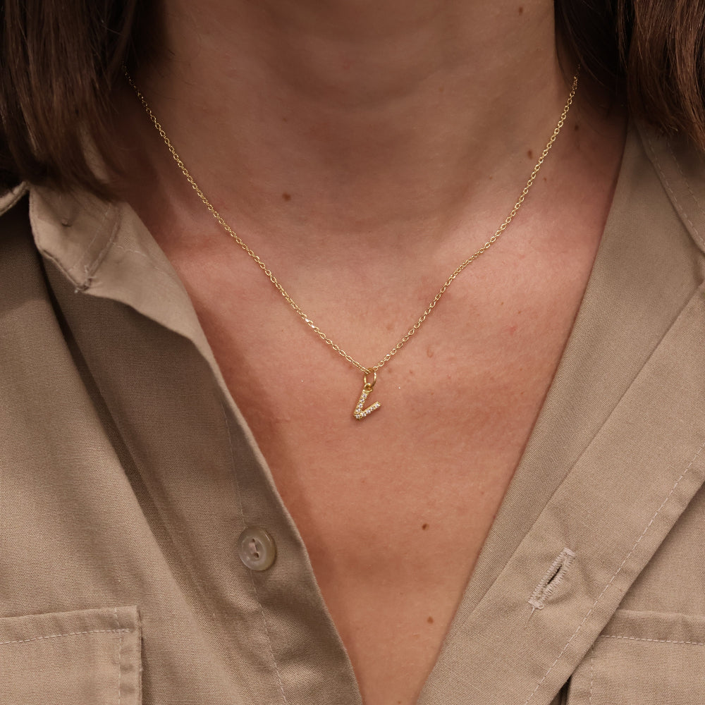 Pendentif petite lettre dorée avec zircons blancs : 5 mm