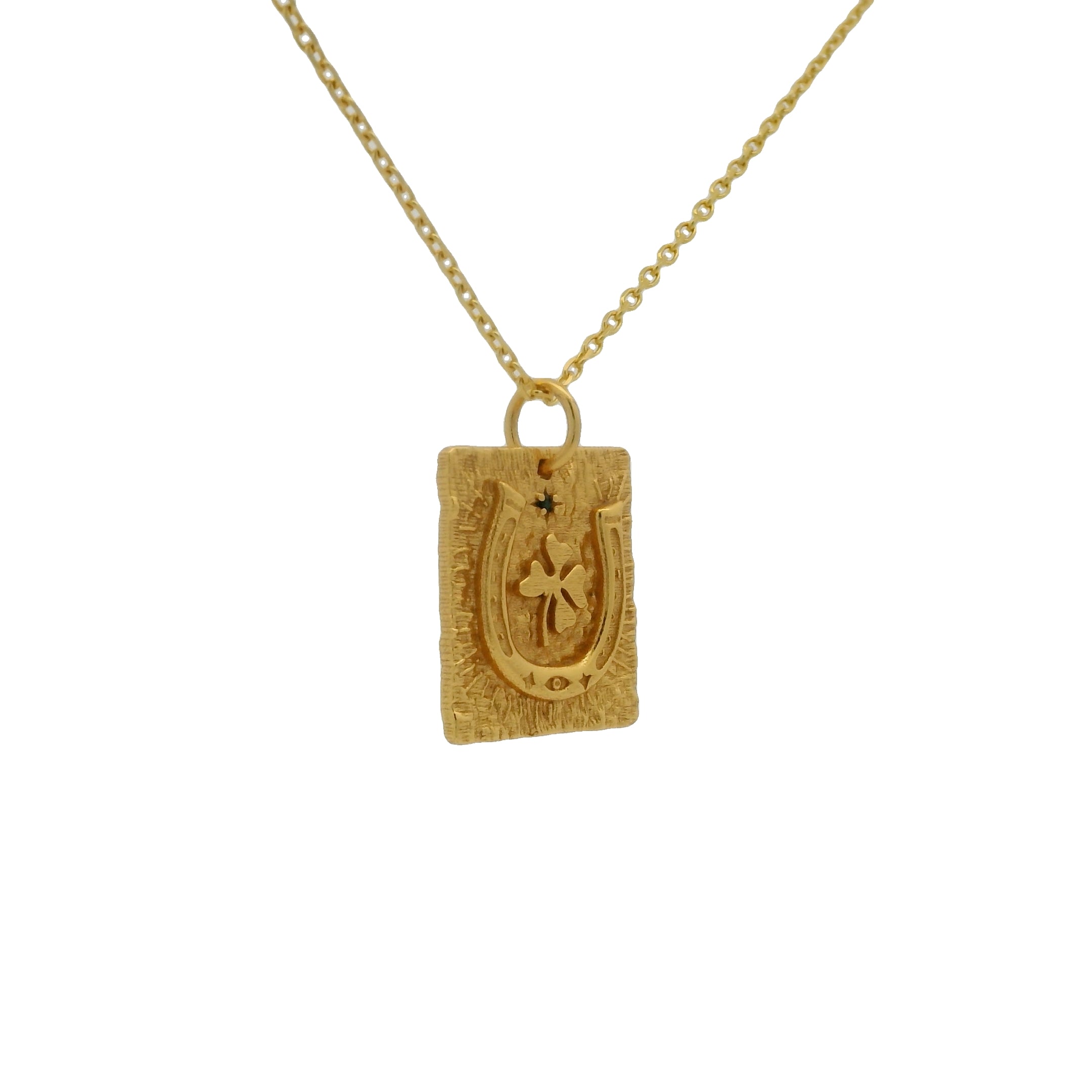 Collier doré plaque fer à cheval trèfle et zircon noir 42 cm