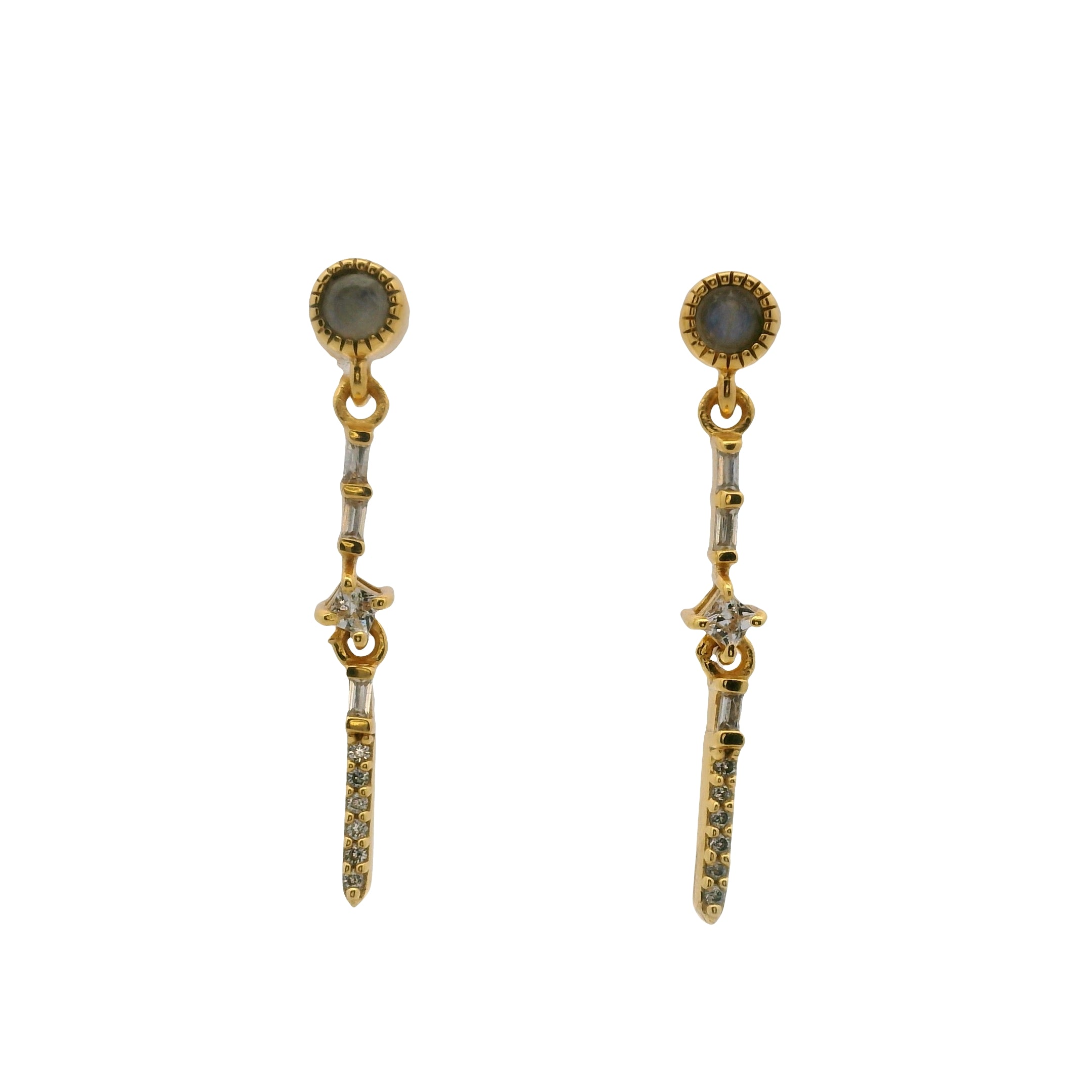 Boucles d'oreilles dorées pendantes en pierre de lune et zircons