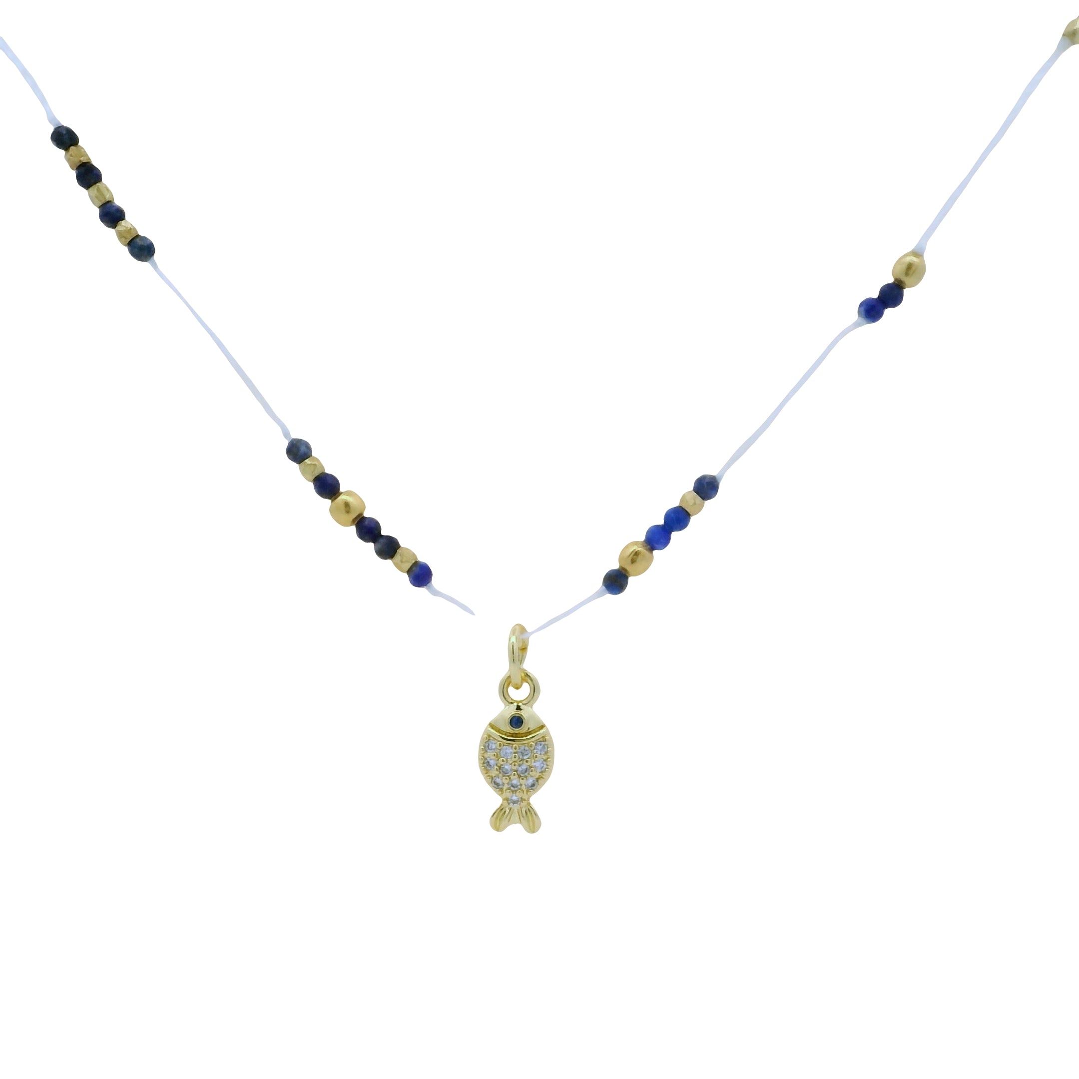 Collier doré fil blanc, lapis facettées et pendentif poisson 42cm