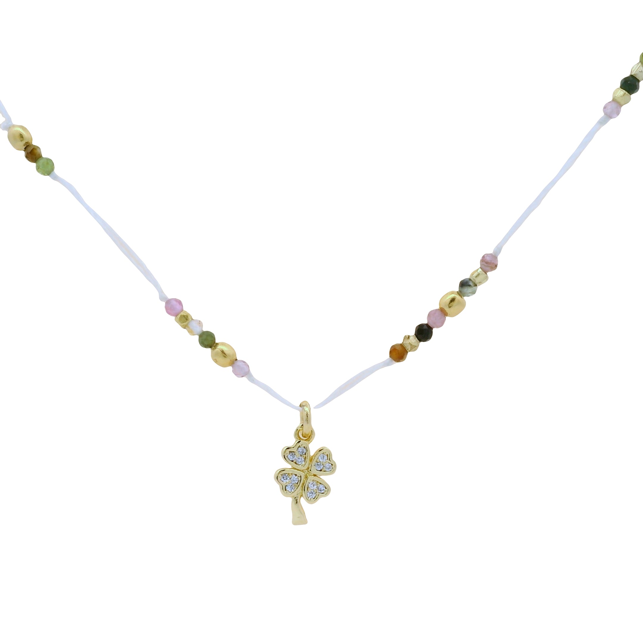 Collier doré fil blanc tourmaline et trèfle zircons 42cm