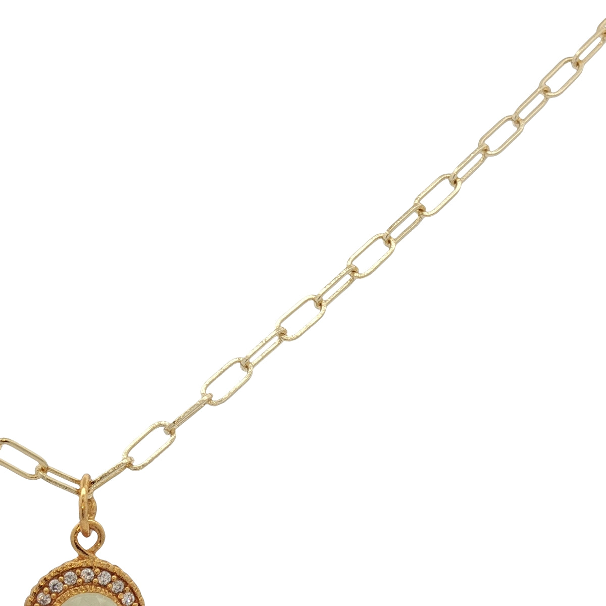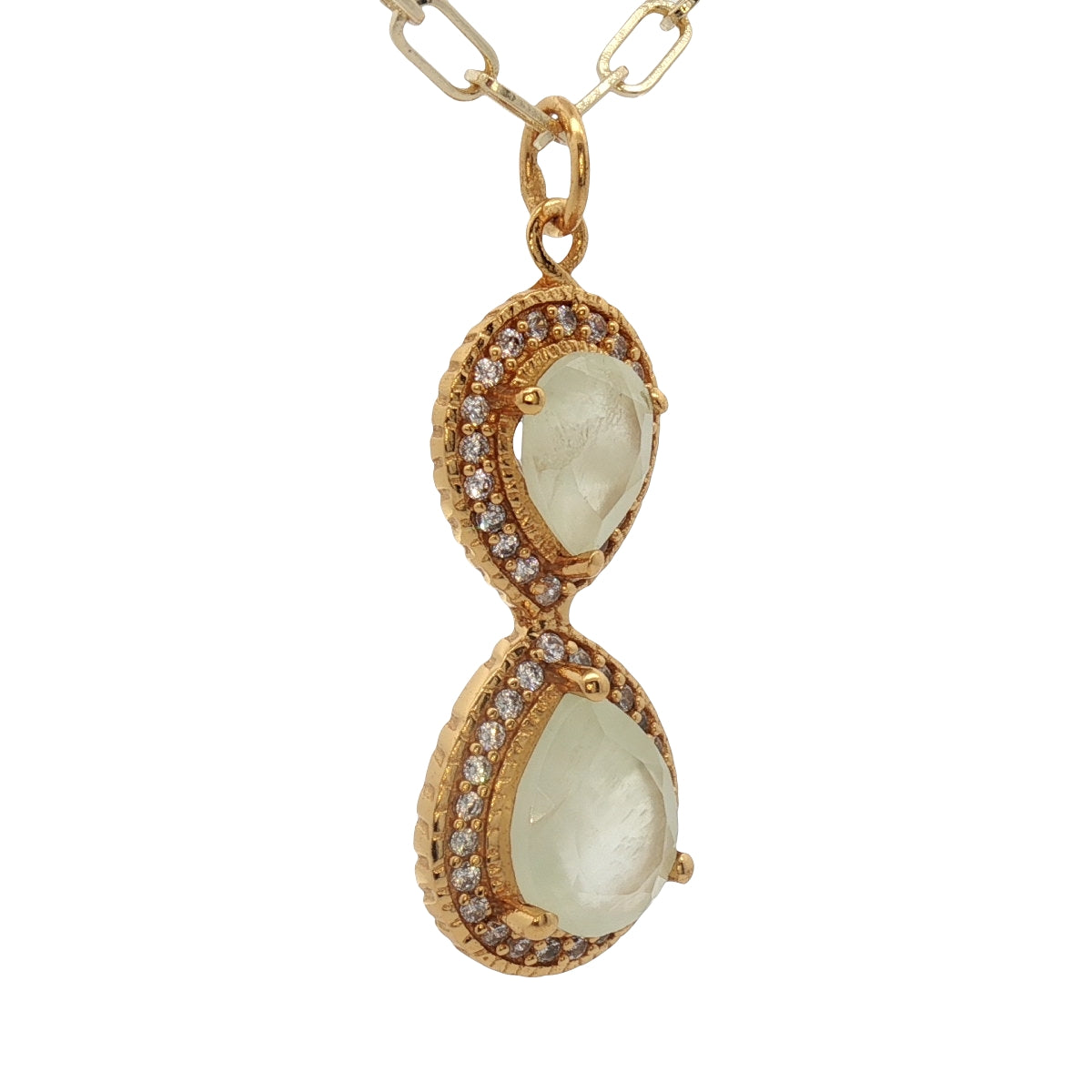 Double prehnite facettée taillée en poire, sertie 3 griffes, entourée de zircons blancs