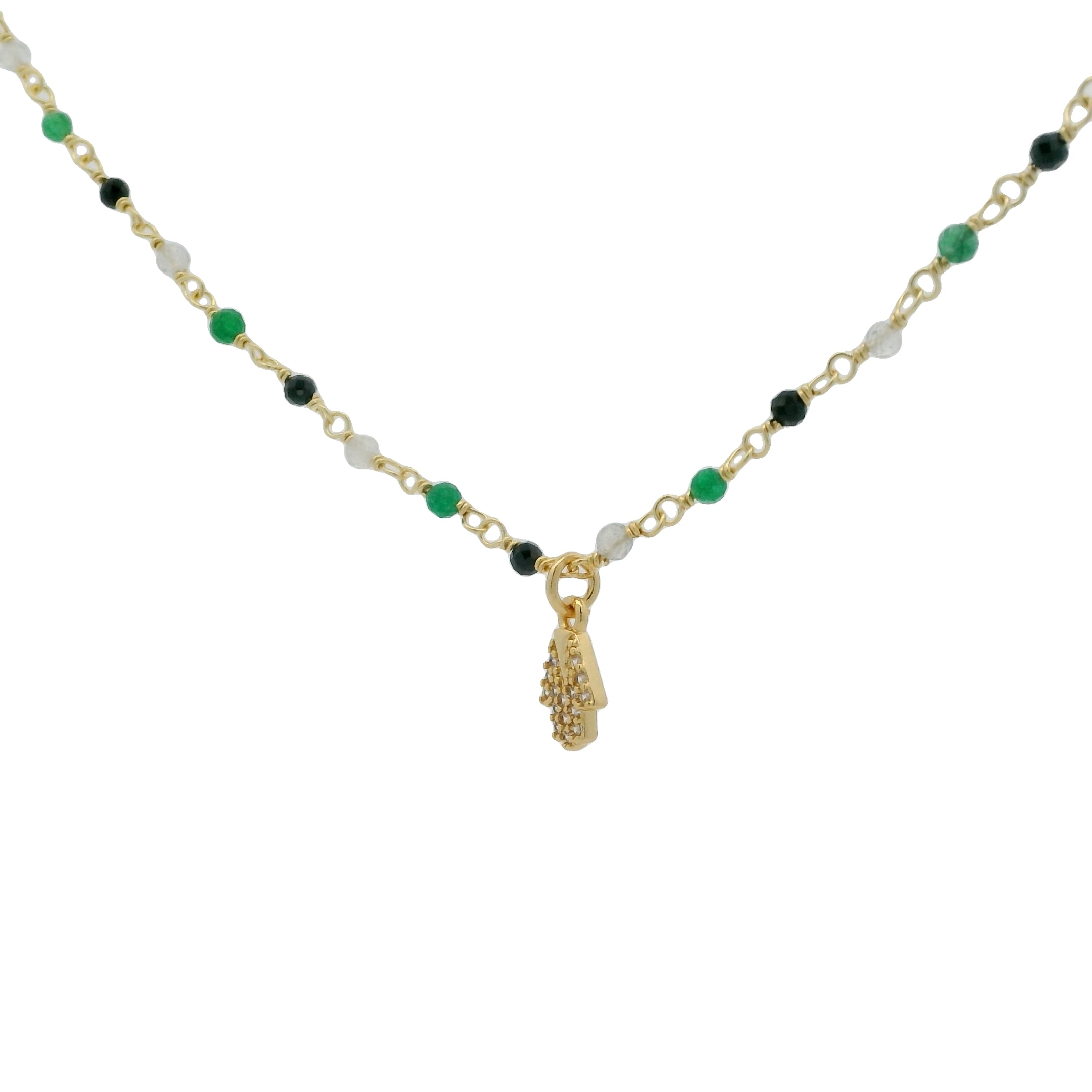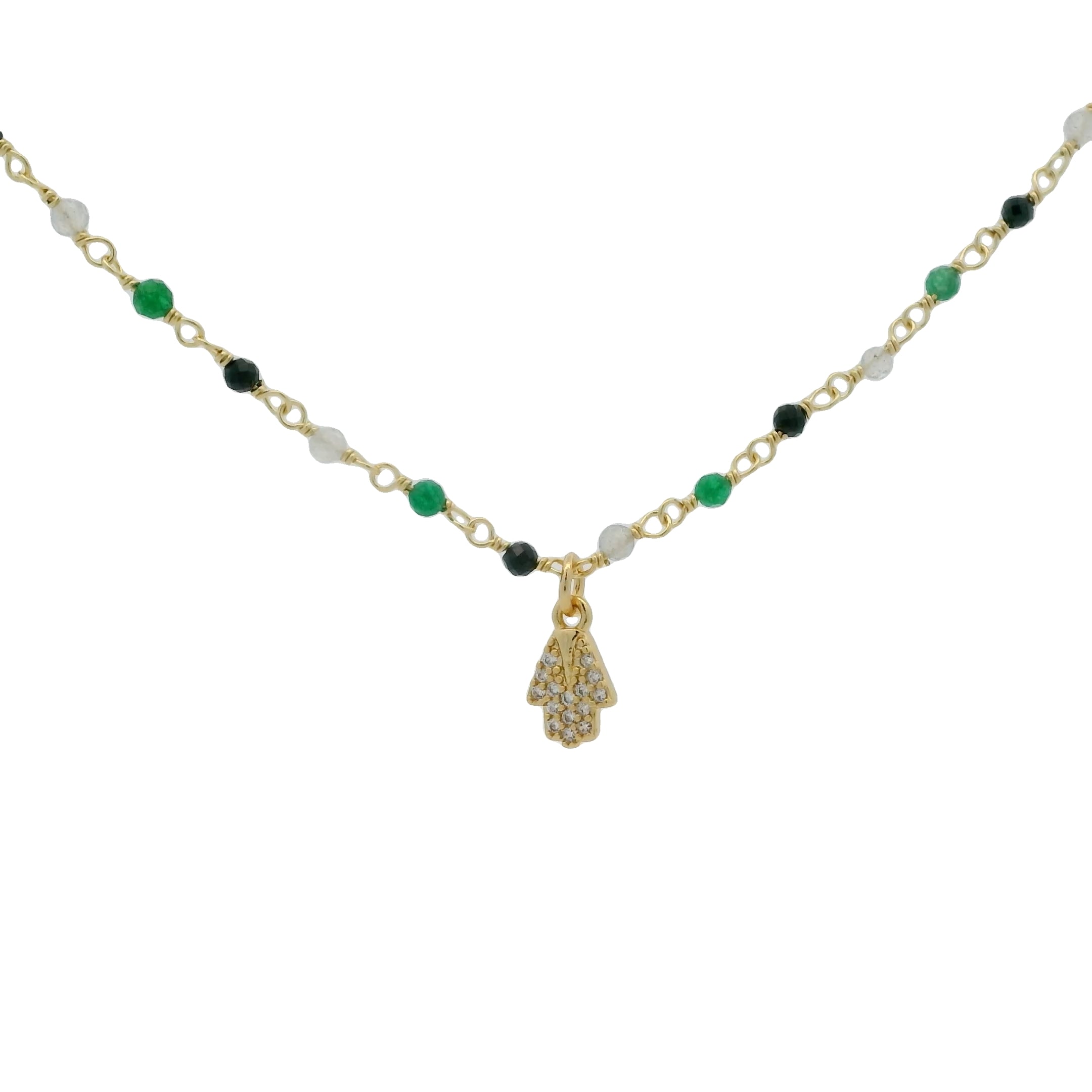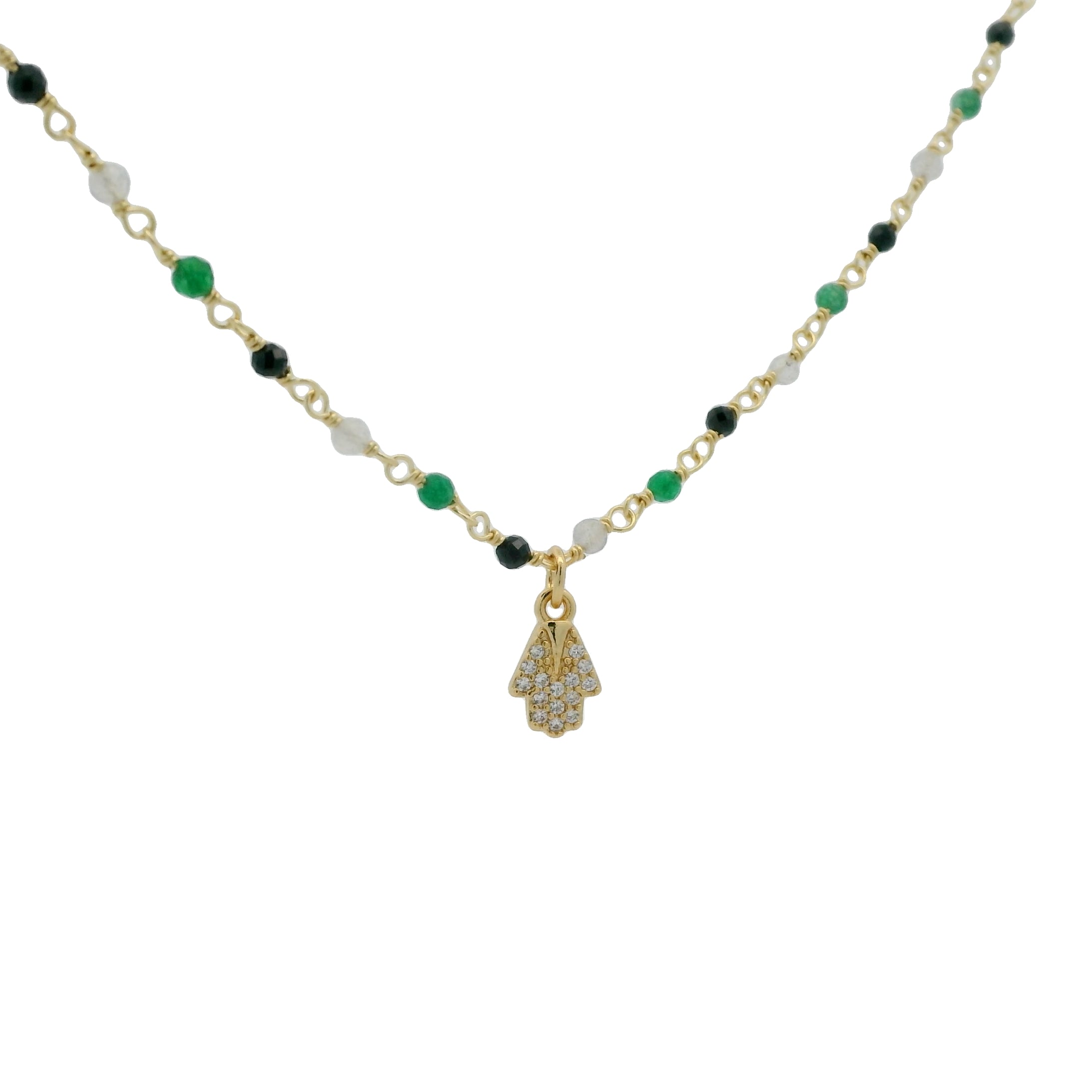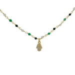 Collier doré rosary pierre de lune onyx verte et noire main de fatma 38 cm