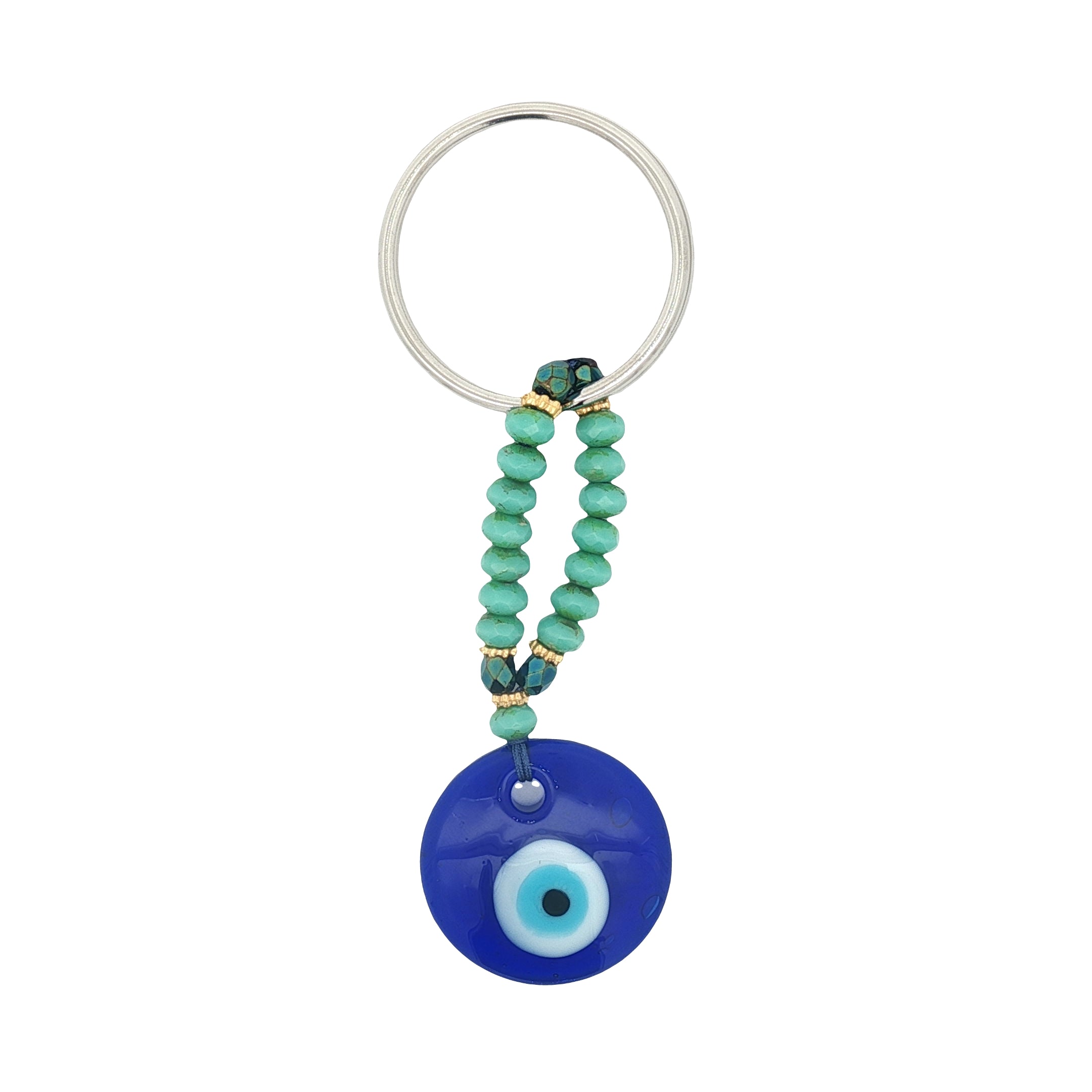 Porte-clefs oeil rond en pâte de verre soufflé bleu mix perles vertes
