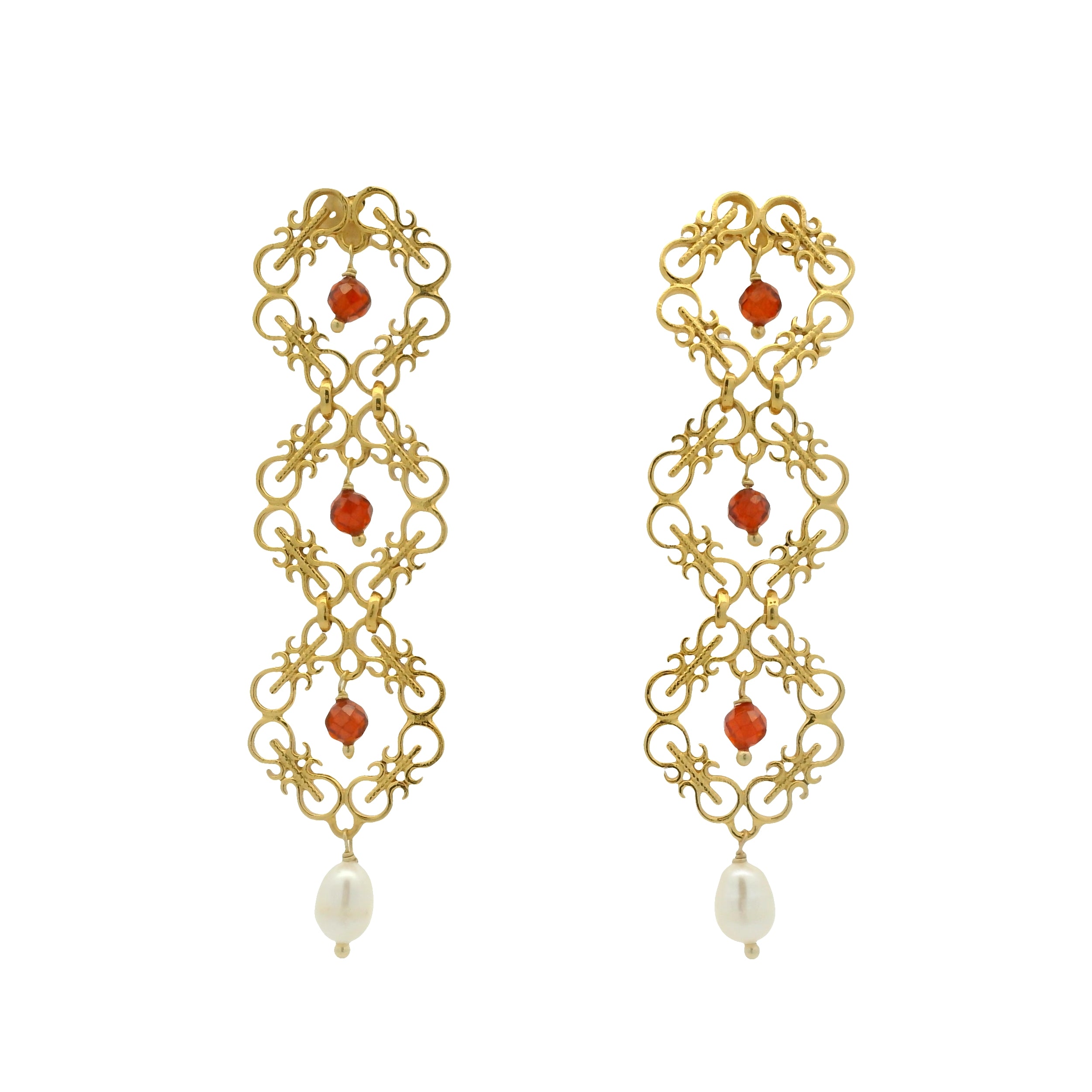 Boucles d'oreilles dorées dentelées onyx rouge et perles