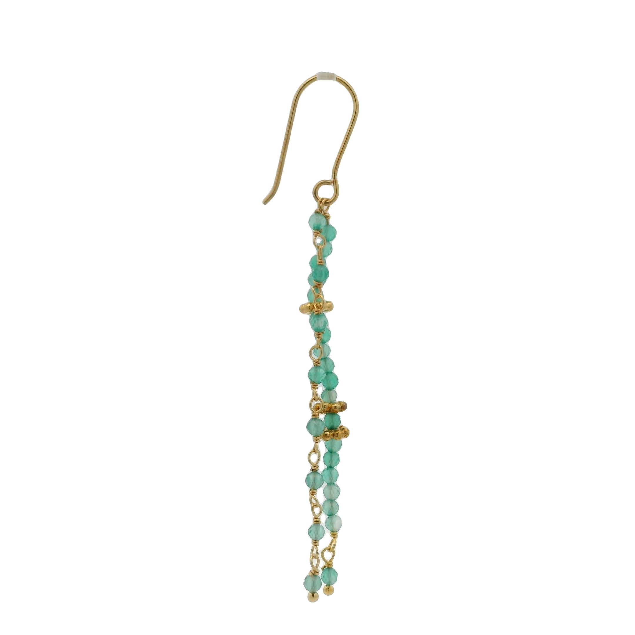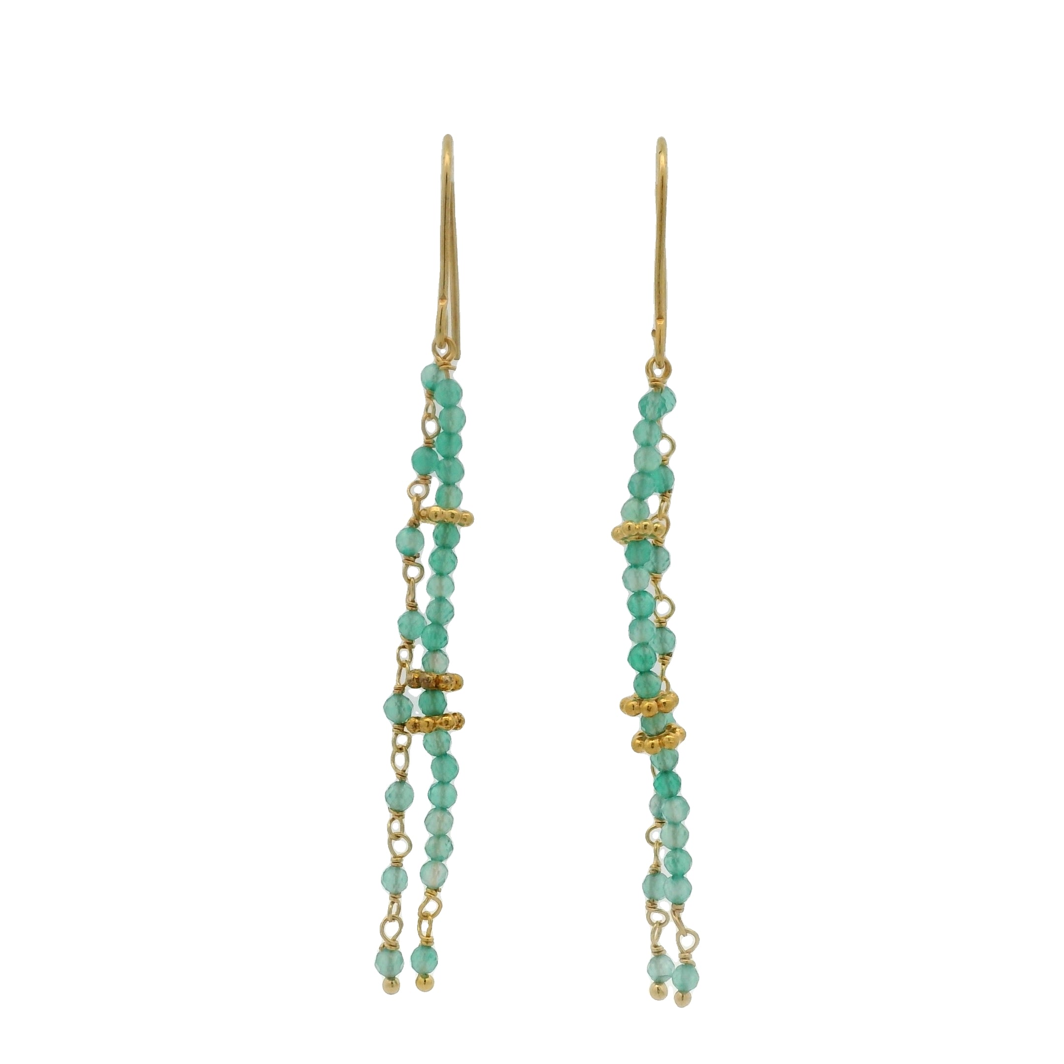 Boucles d'oreilles dorées pendantes onyx verte et couronnes dorées