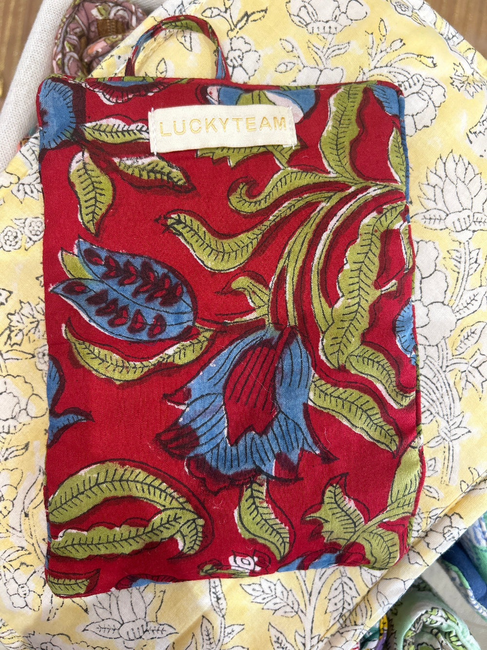 Pochette à bijoux rouge fleurs bleues et intérieur vert