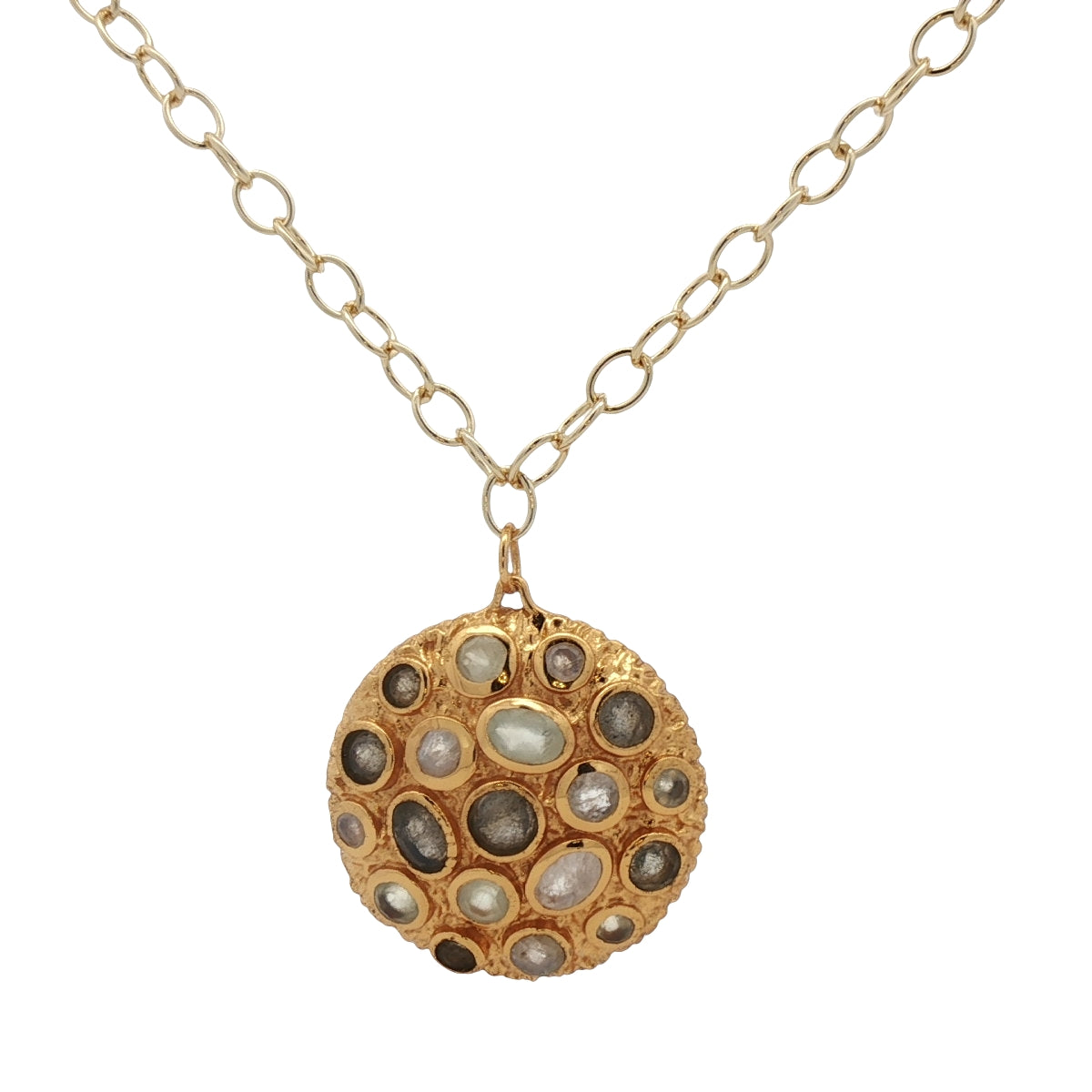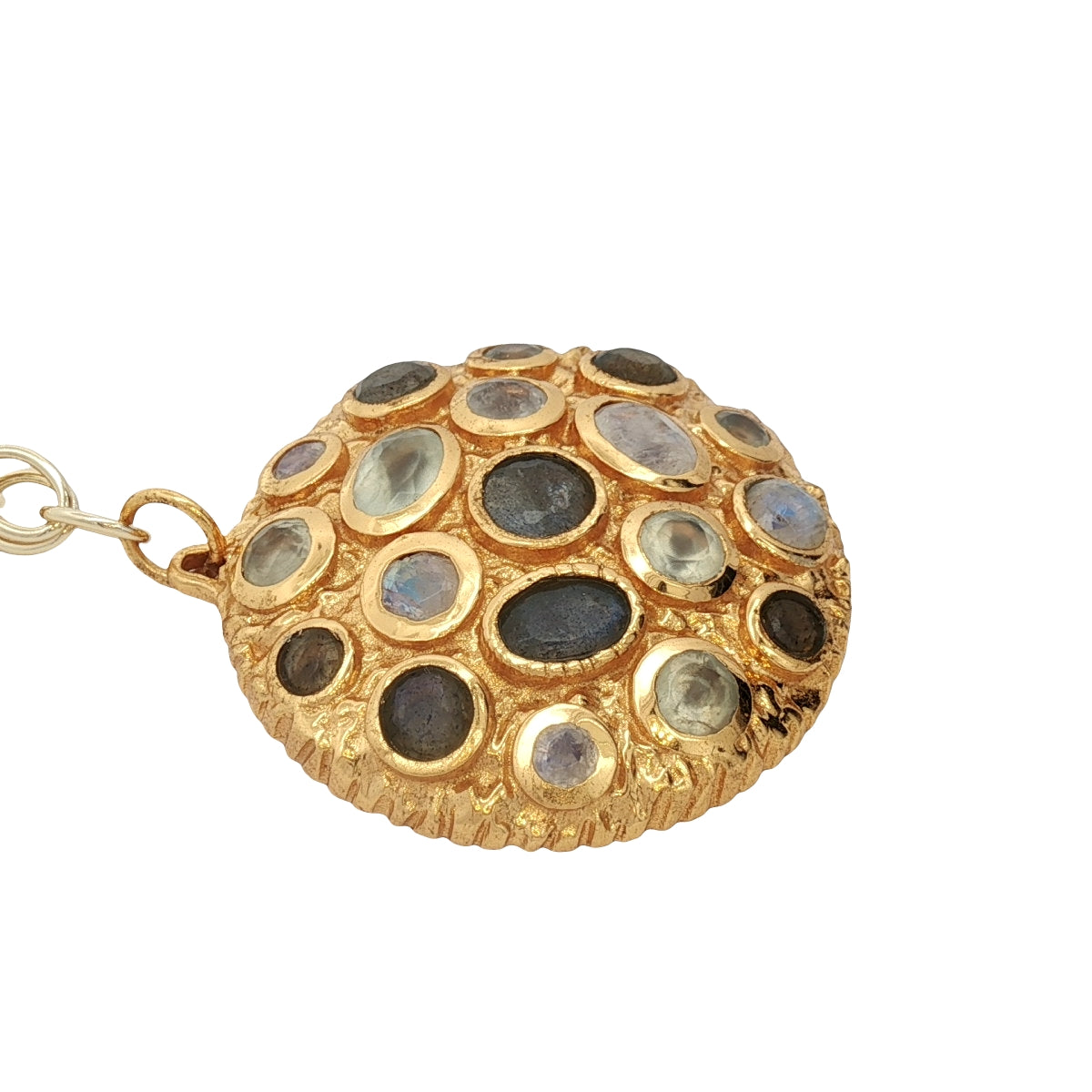 Collier doré médaillon massif avec pierre de lune et labradorite 75 cm