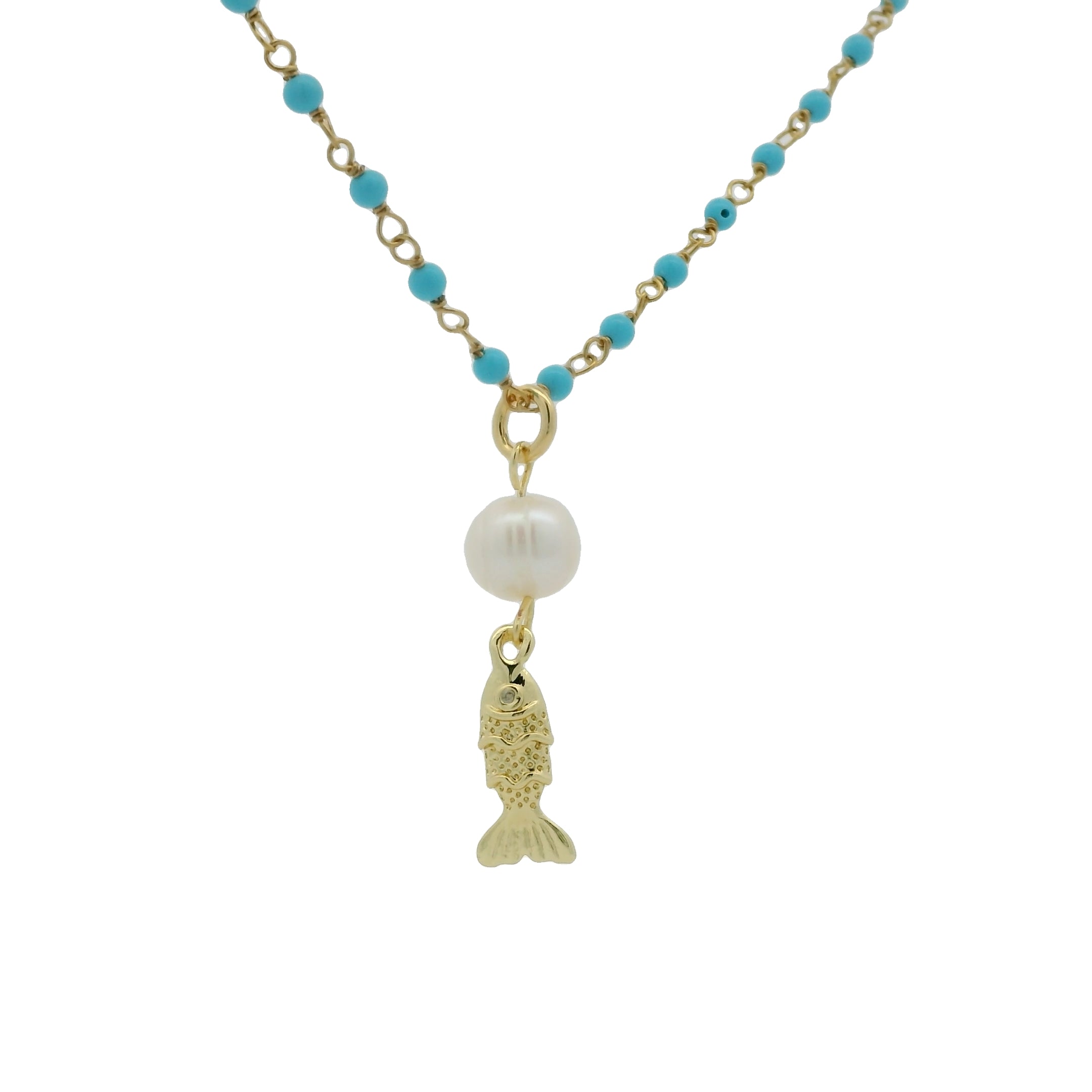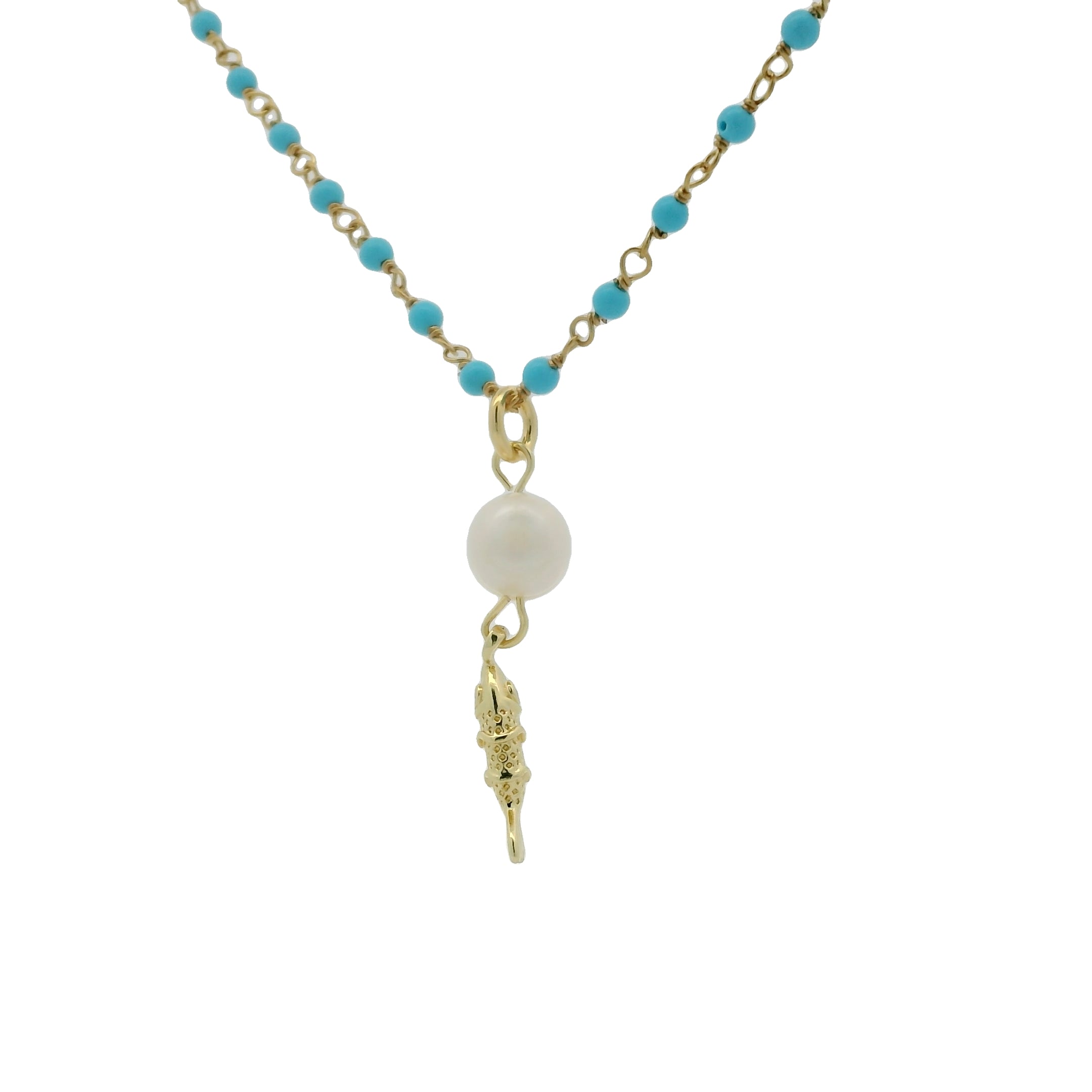 Collier rosary doré turquoise et perle de culture poisson 70cm