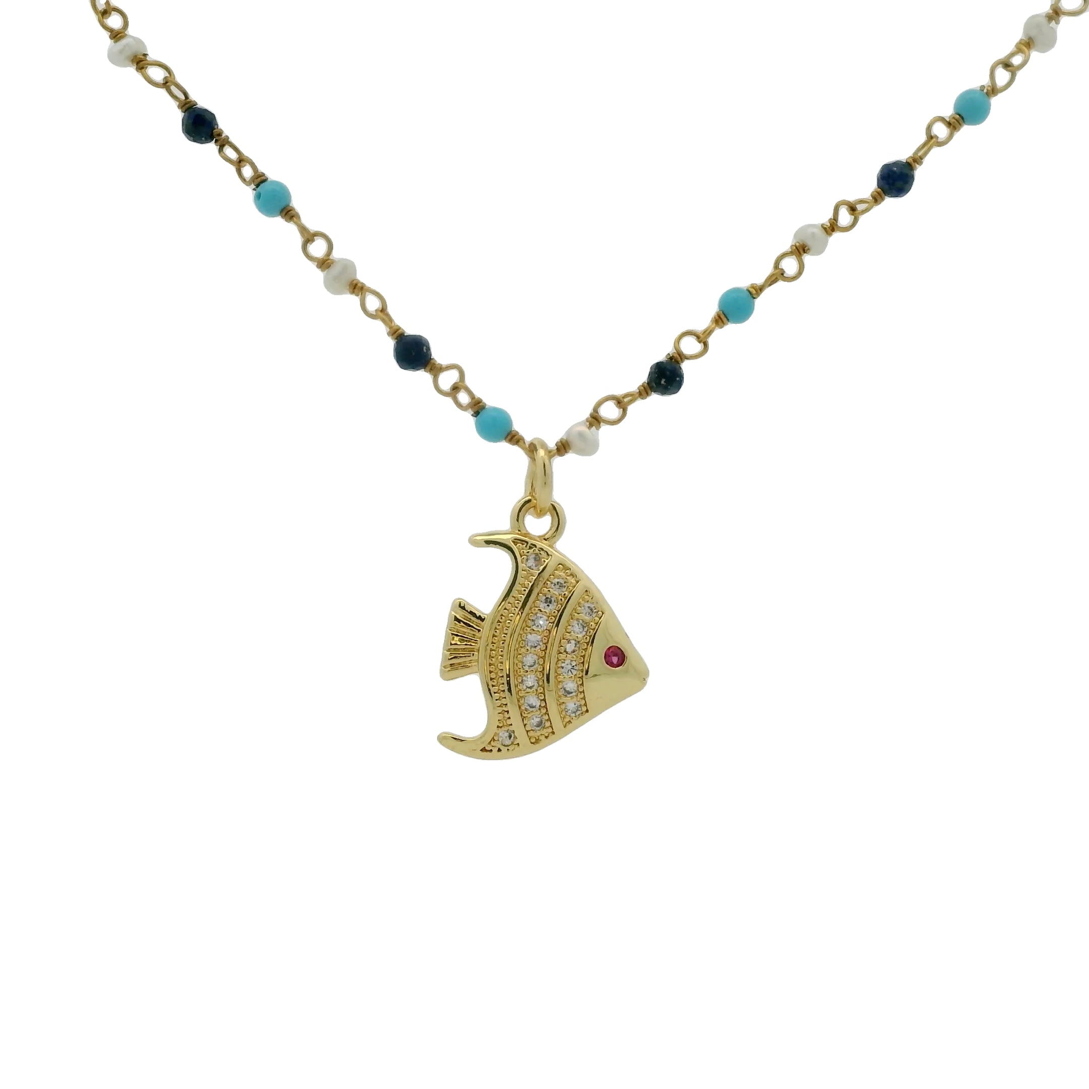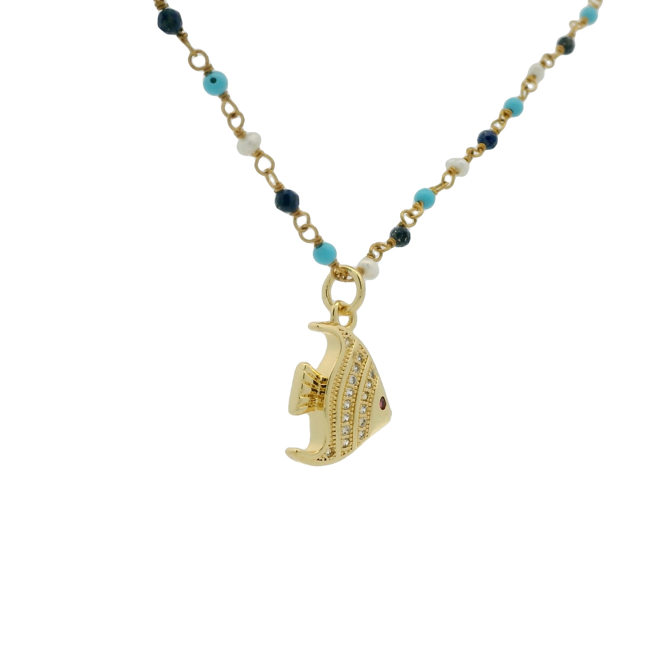 Sautoir doré rosary turquoise perles lapis et poisson 80 cm