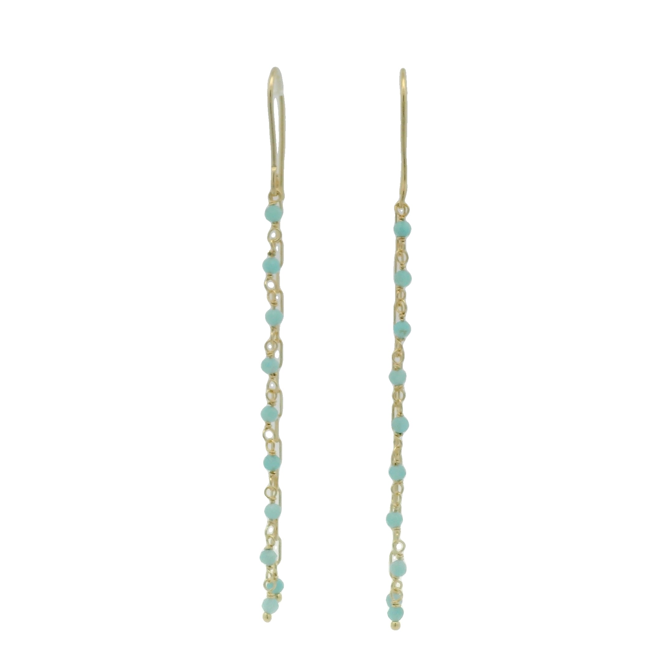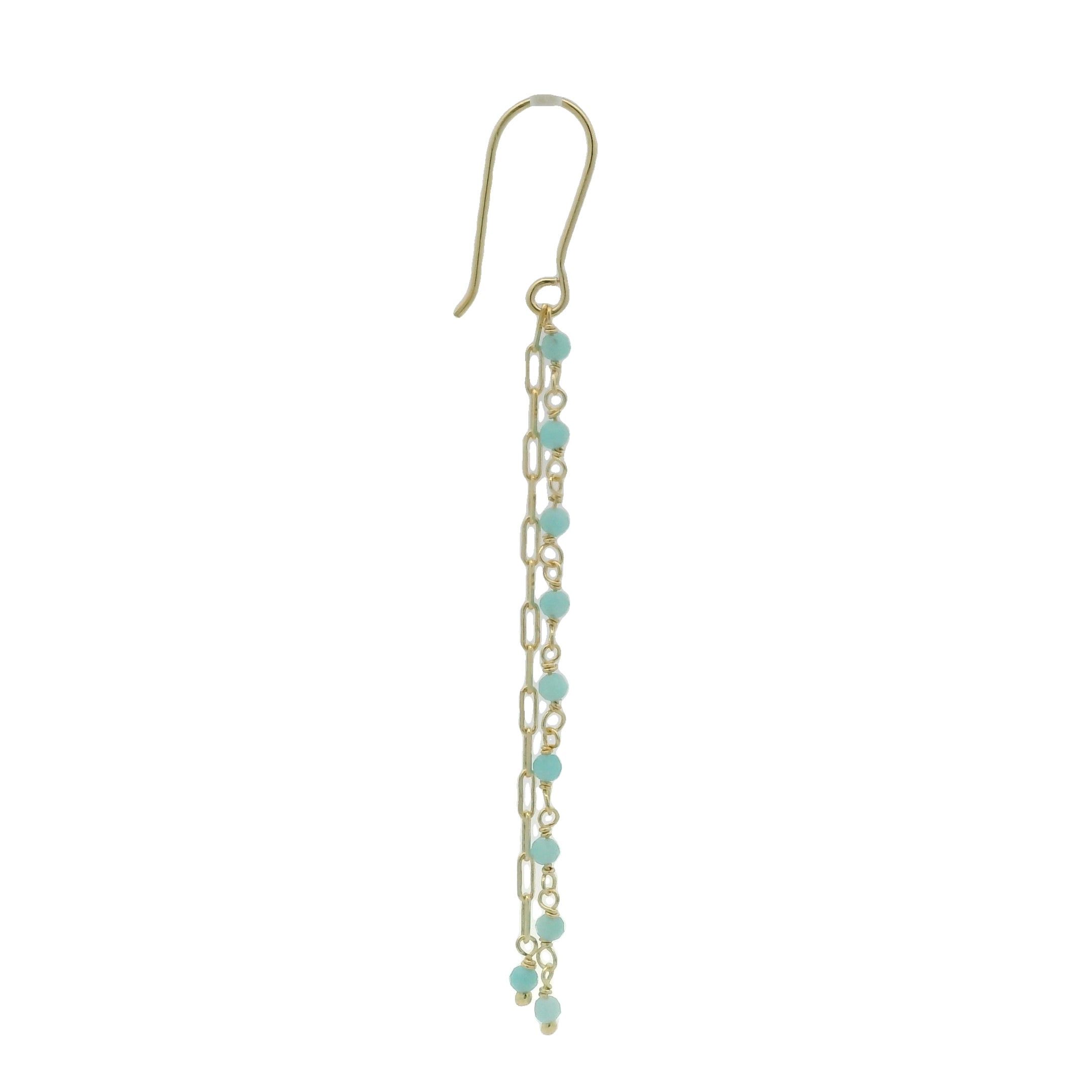 Boucles d'oreilles pendantes dorées moitié chaine et Santa Maria en Amazonite