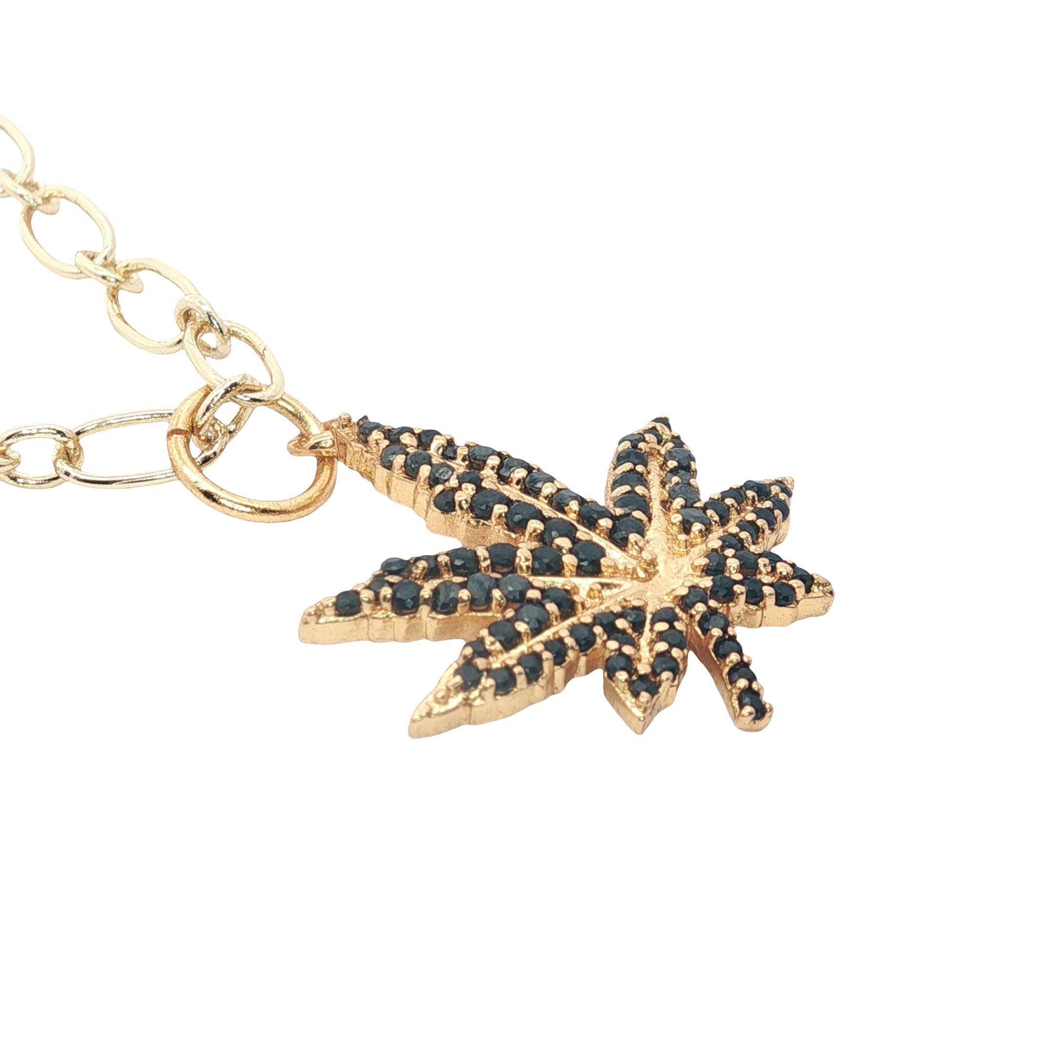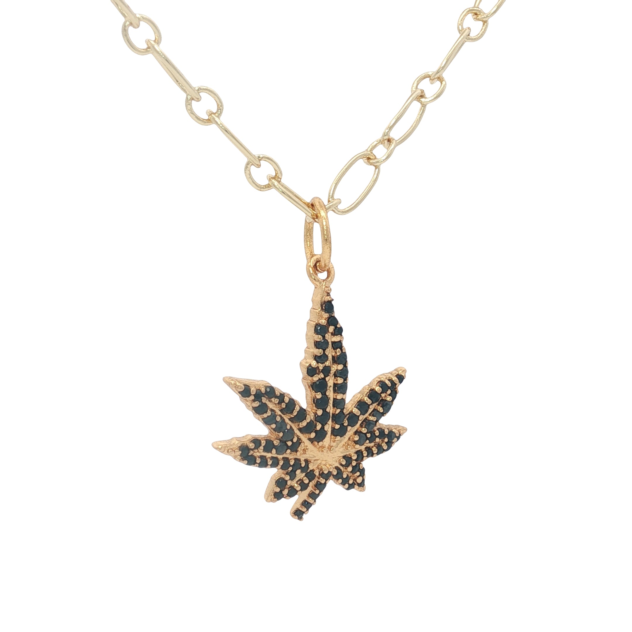 Collier doré feuille de chanvre en zircons noirs 42 cm