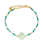 Bracelet doré onyx verte et perles dorées avec trèfle en prehnite