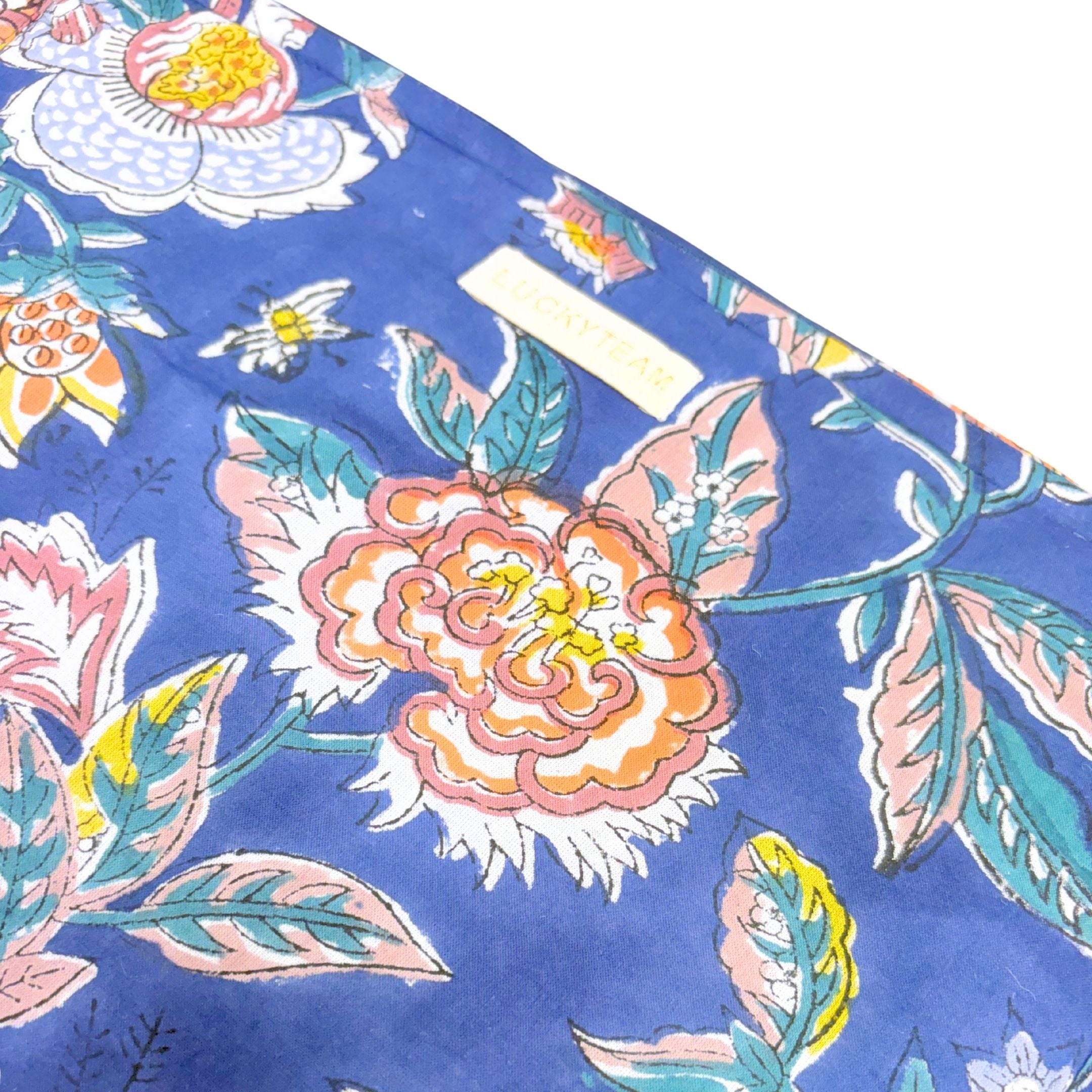 Grande pochette Block Print bleu marine à fleurs oranges et blanches : 29 cm x 22 cm