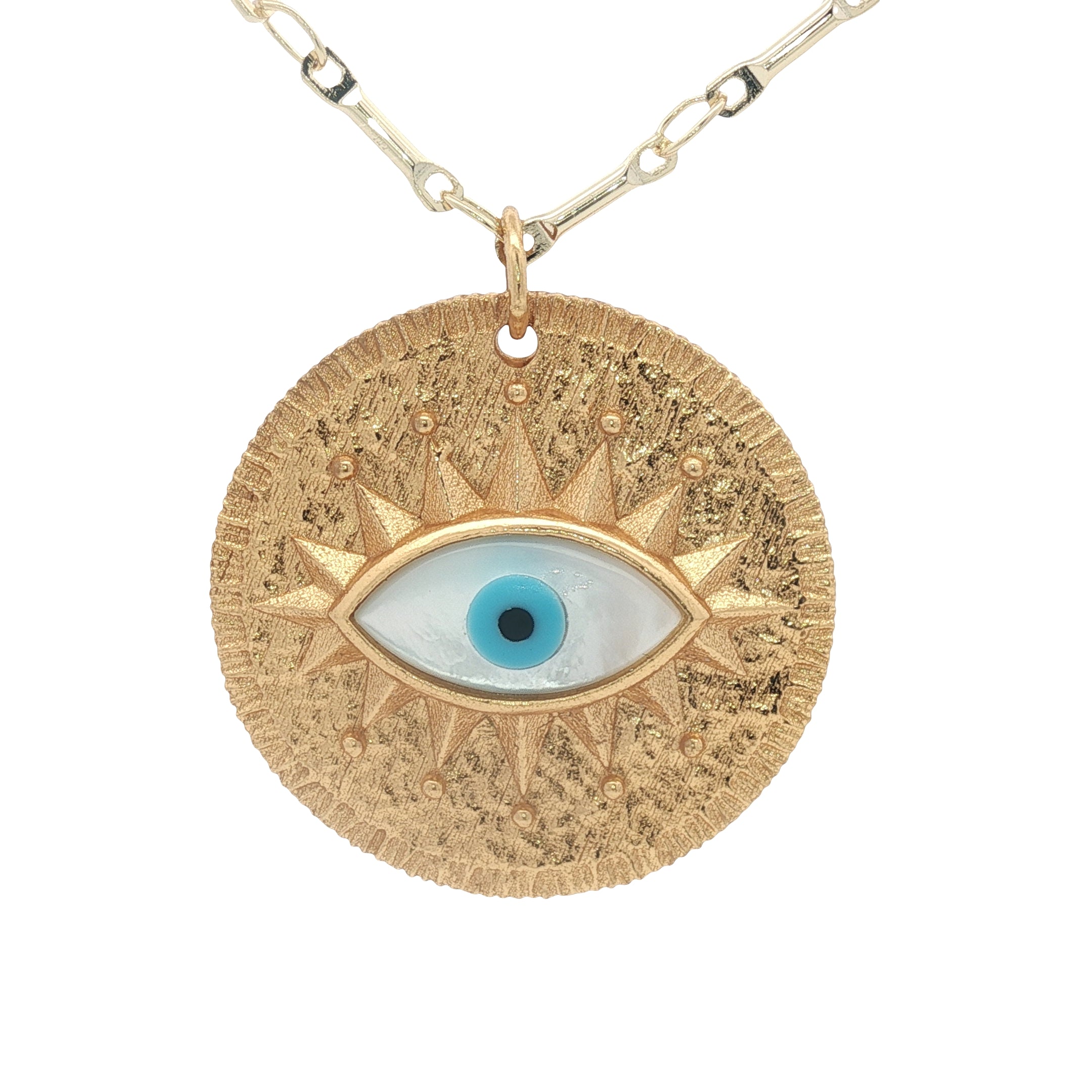Collier doré grande médaille avec oeil en nacre en relief 60 cm
