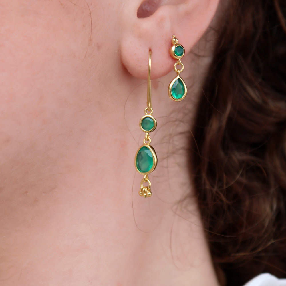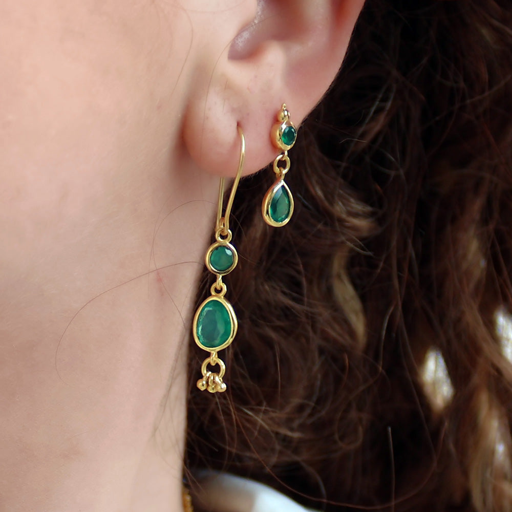 Earrings in brass gilded with 18k fine gold and semi-precious natural stones. The earring is made up of two hand-faceted stones and ends with a tassel of golden balls.