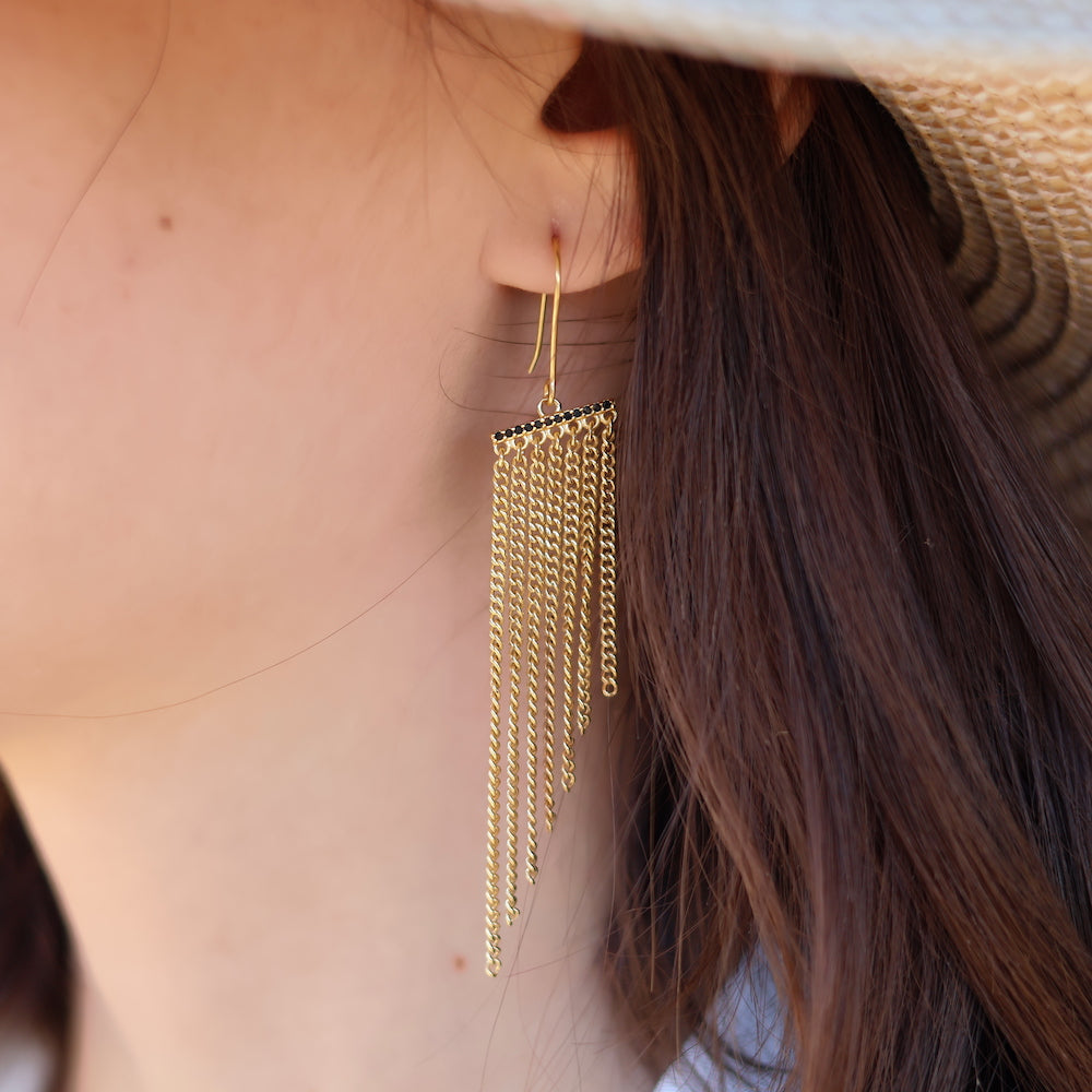 Golden cascade earrings of chains and zircons