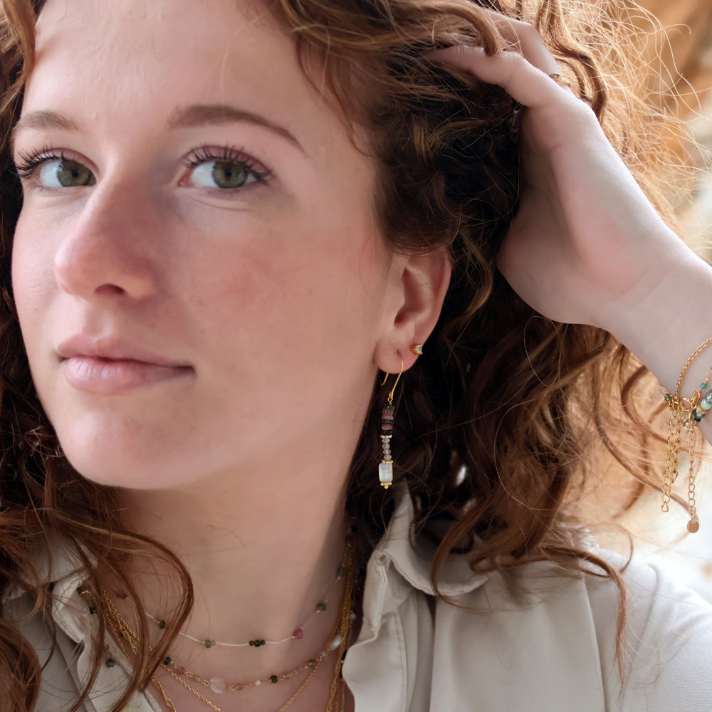 Dangling earrings in brass gilded with 18k fine gold and hand-cut stones of different shapes.