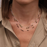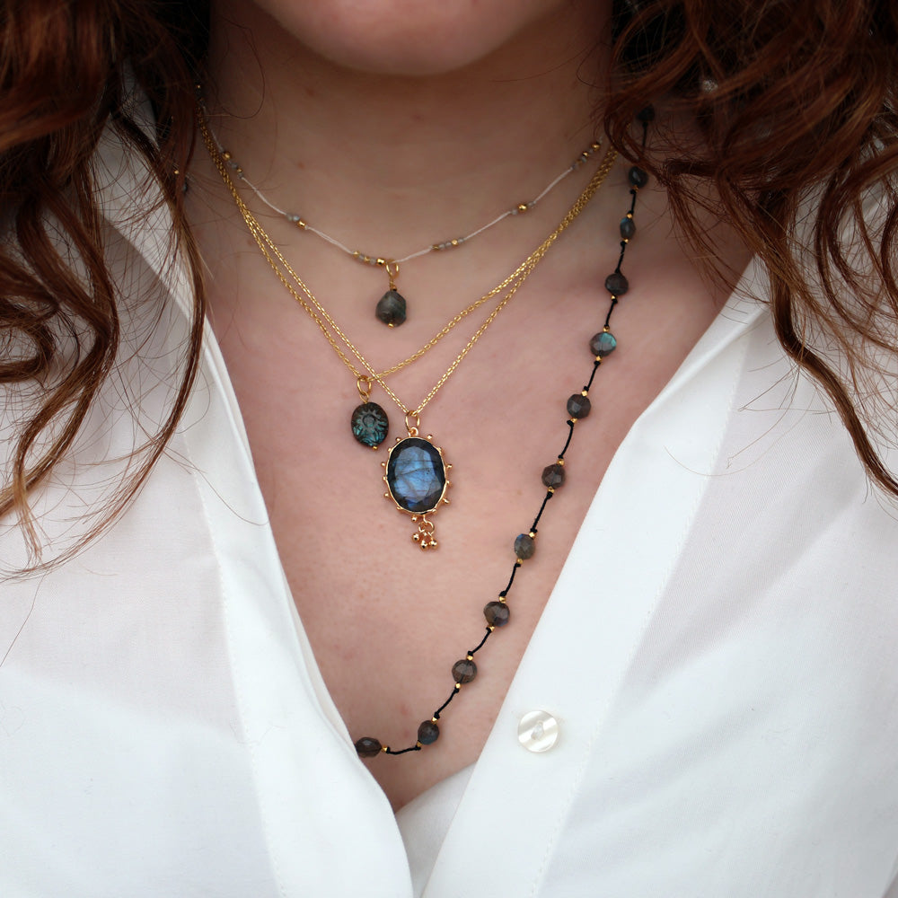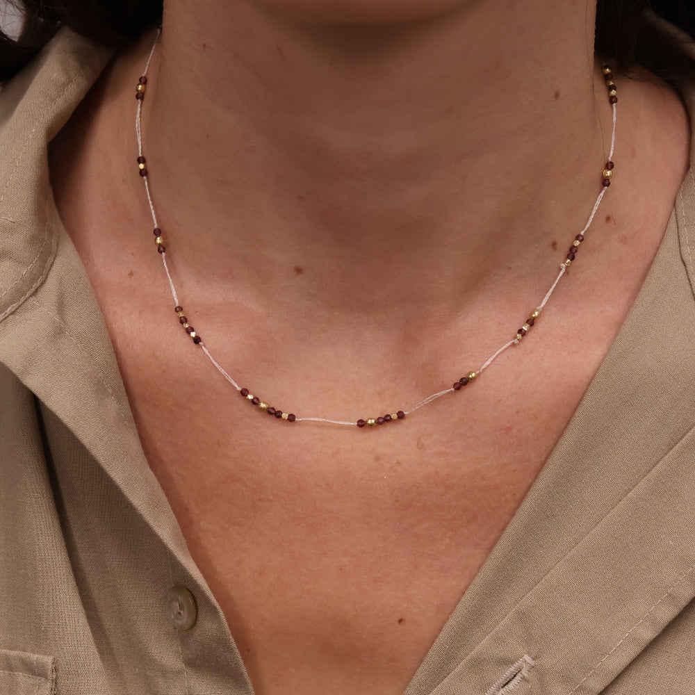 Necklace in beige thread and faceted natural stones.