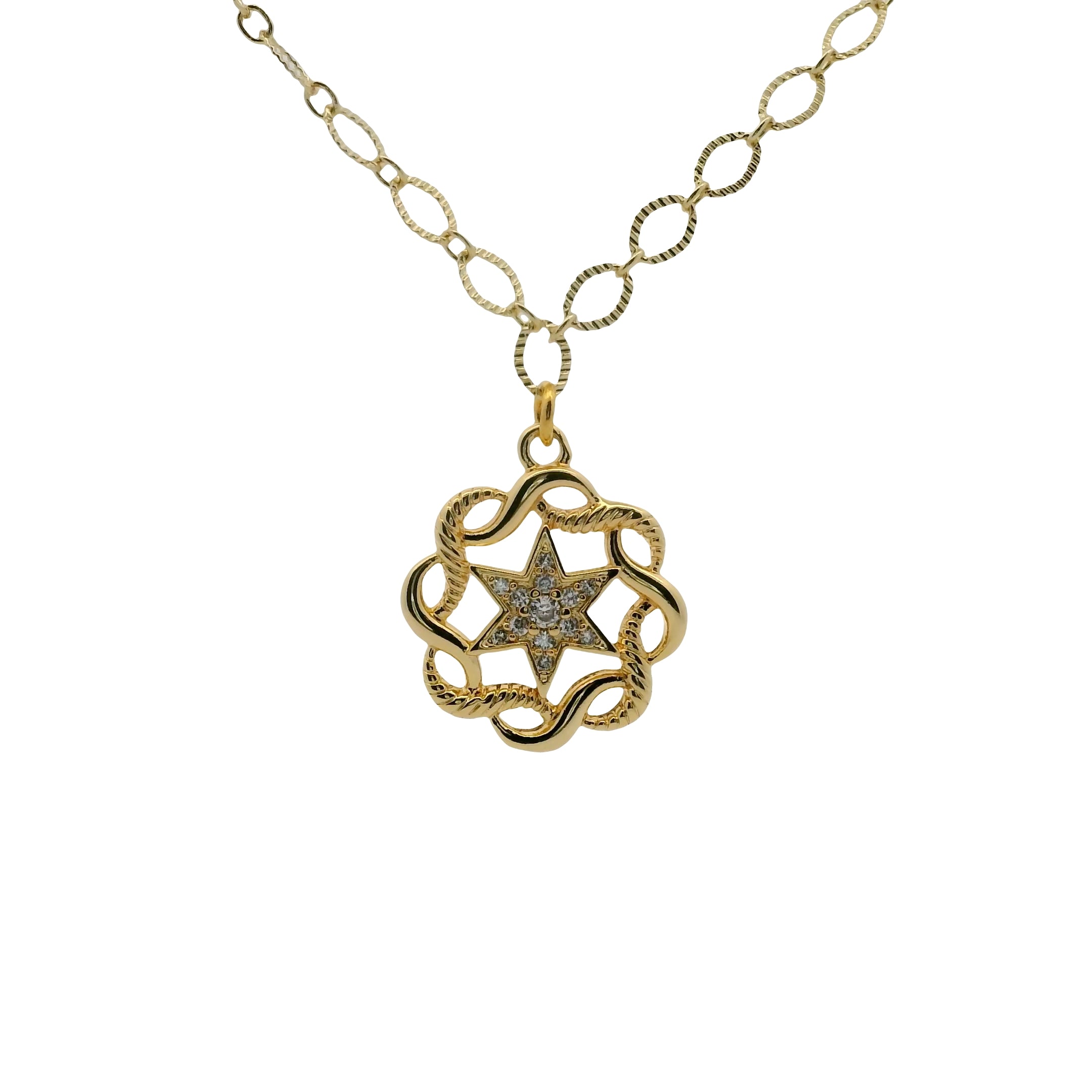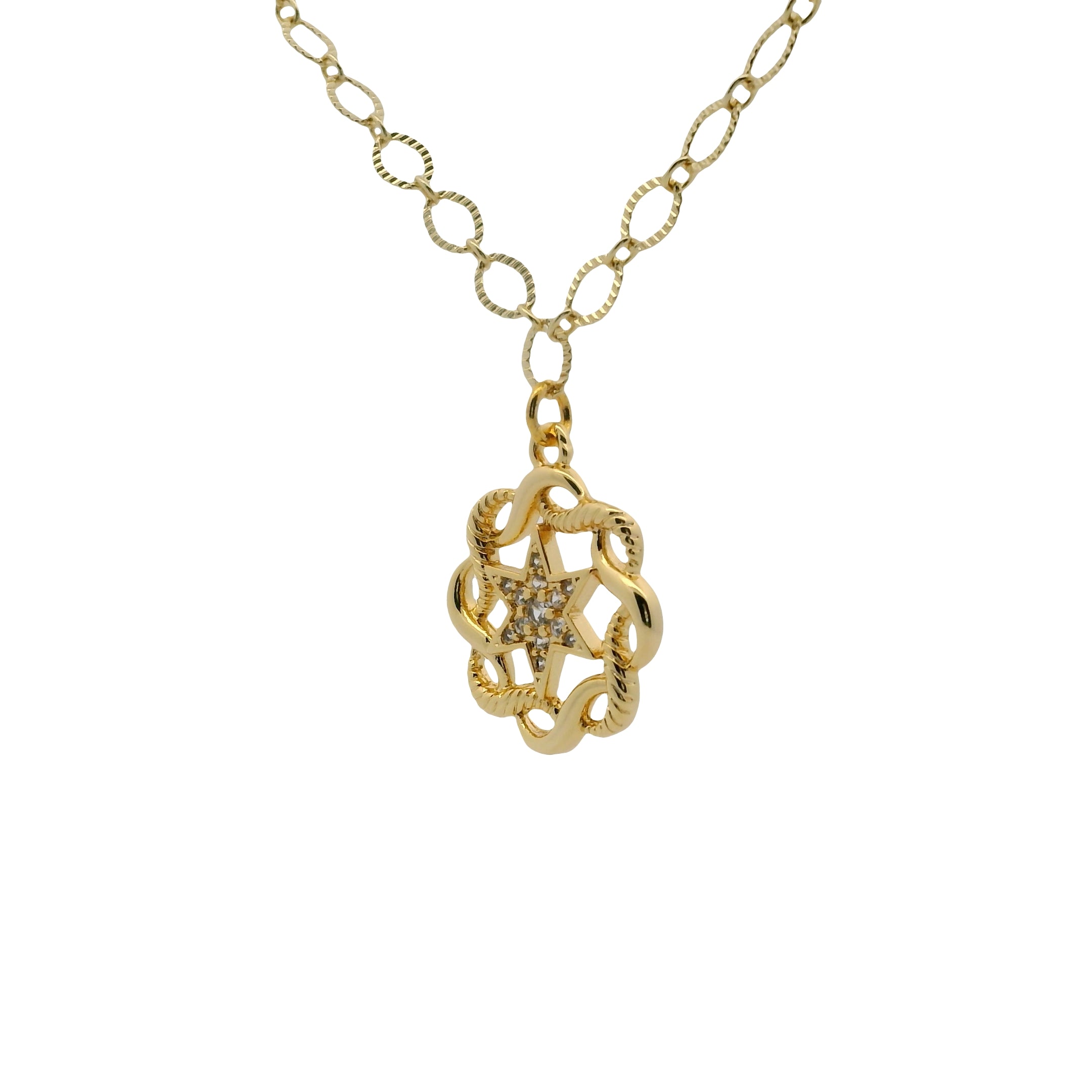 Pendentif médaille ajouré, étoile au centre serti de zircons blancs : 18mm x 18mm