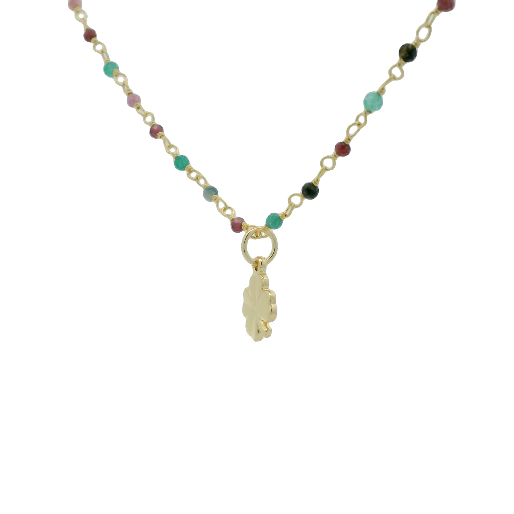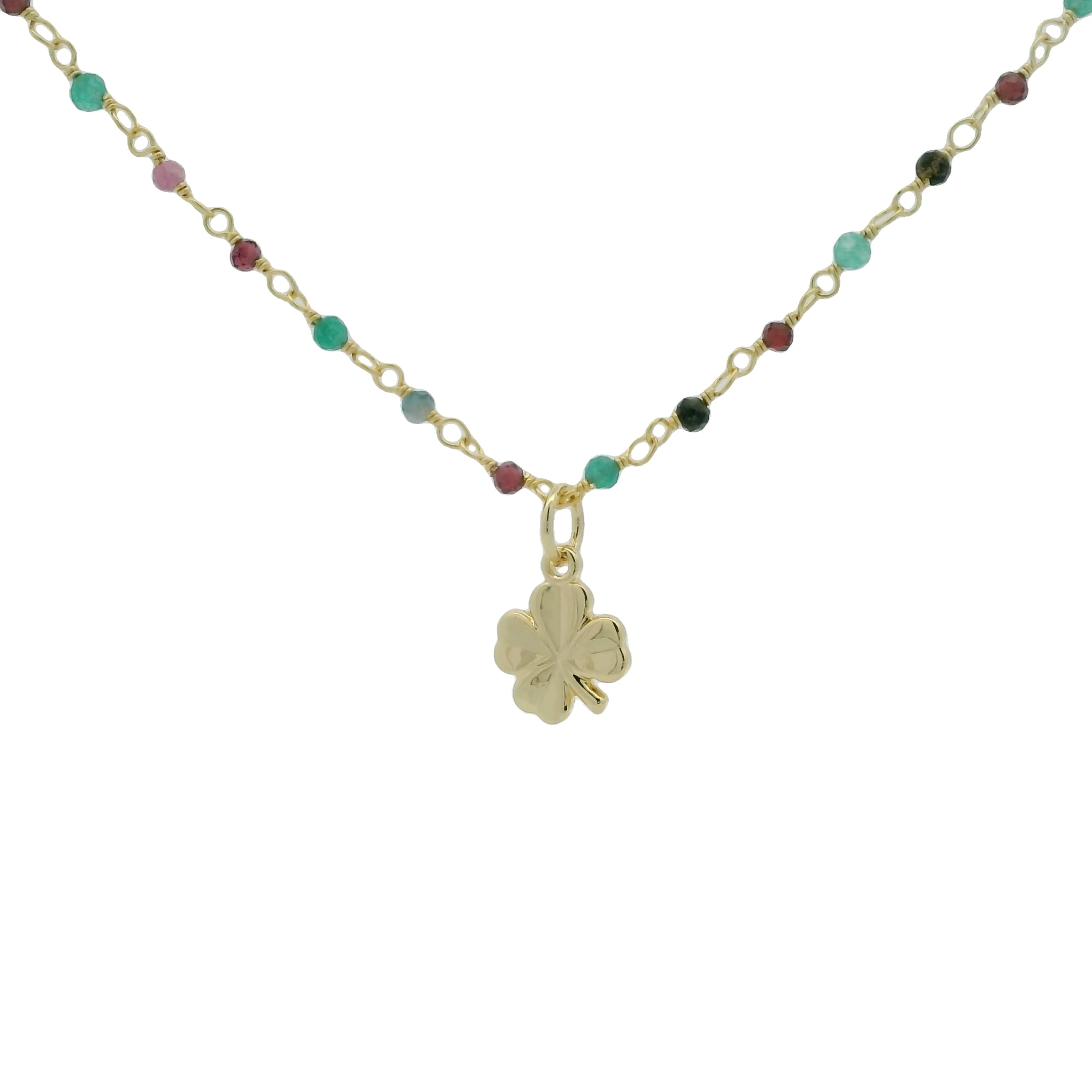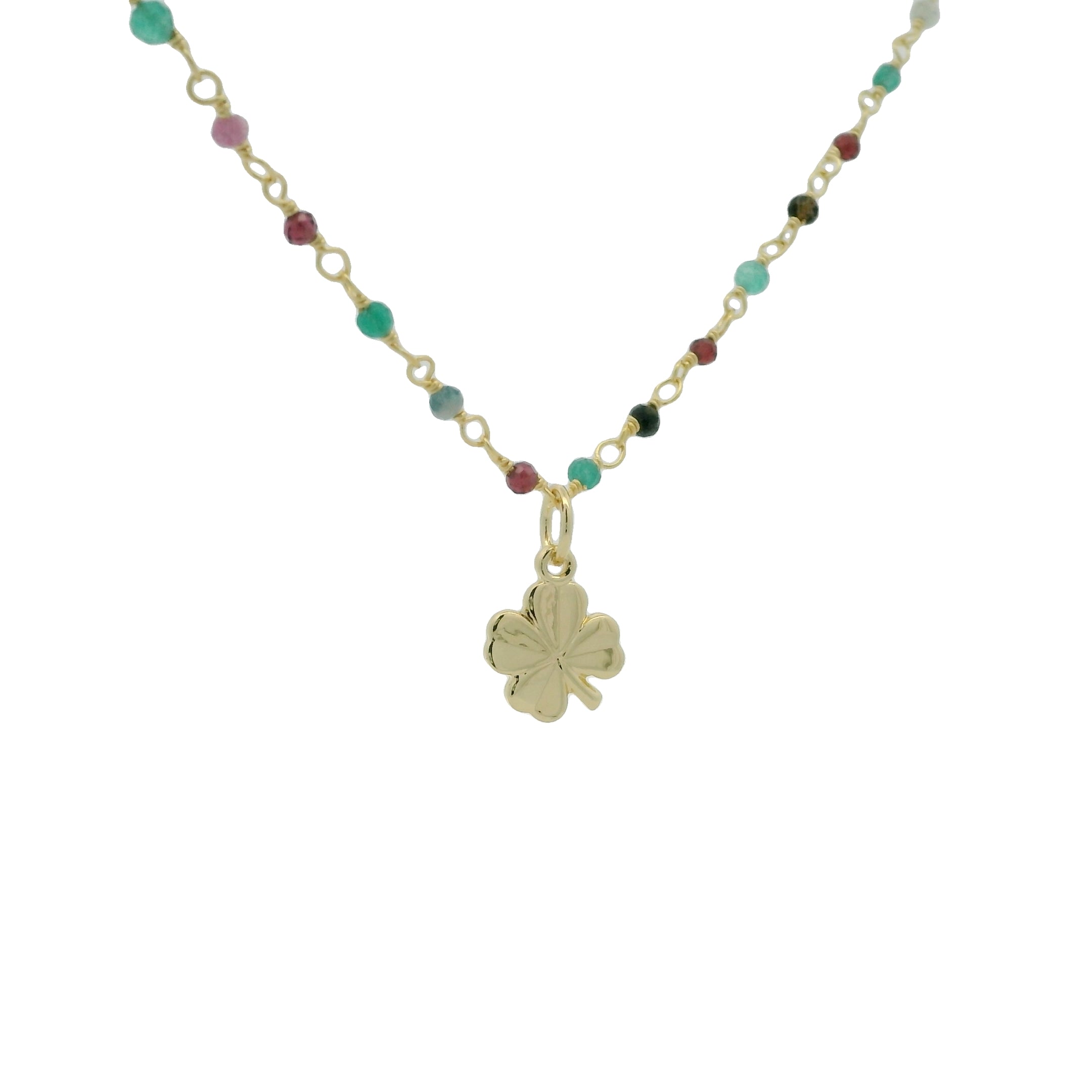 Collier doré rosary onyx verte grenat et trèfle 50 cm